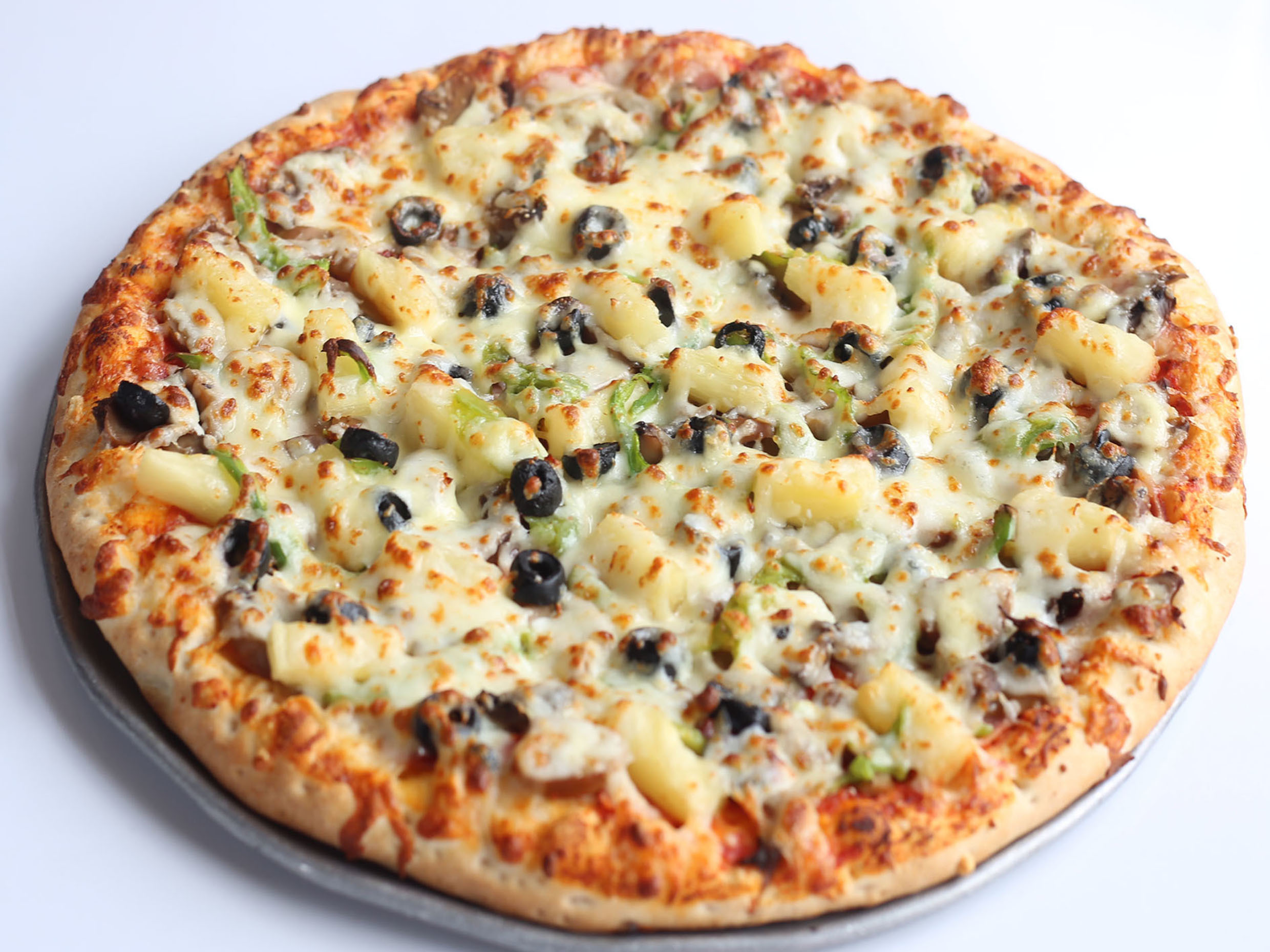2 x 1 siempre, champiñón, pimiento verde, cebolla, aceitunas negras, jitomate y extra queso.