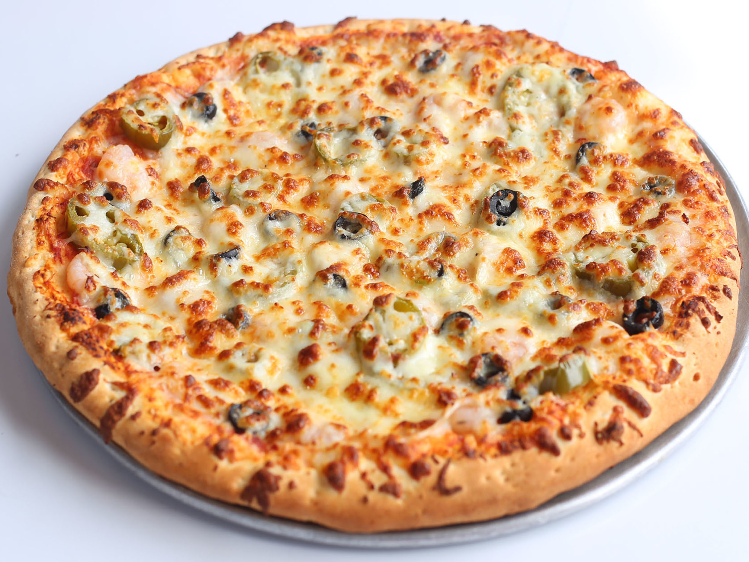 2 x 1 siempre, camarón, aceitunas negras, cebolla, jalapeño y extra queso.