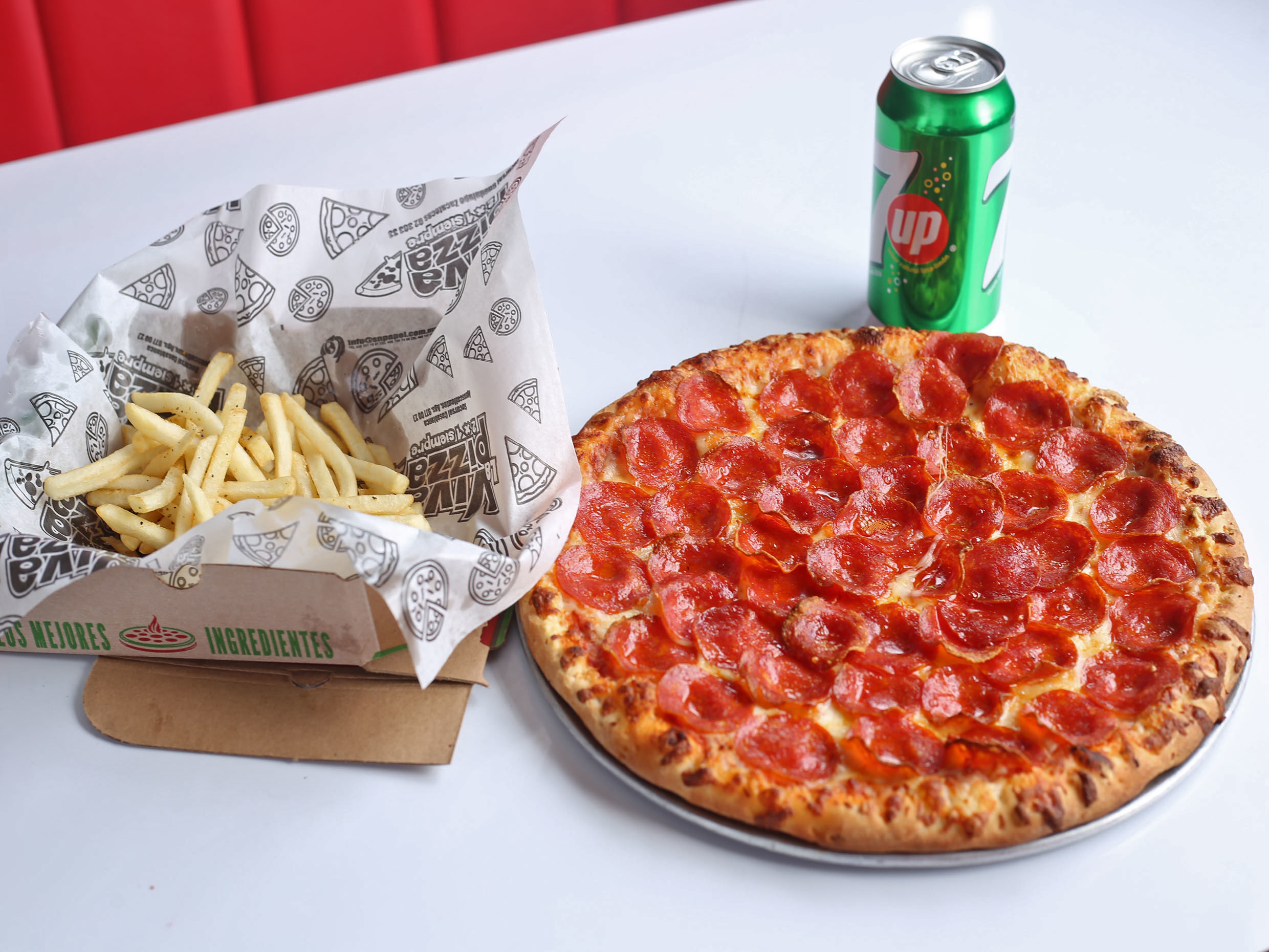 1 pizza personal, 1 papas y 1 refresco lata.