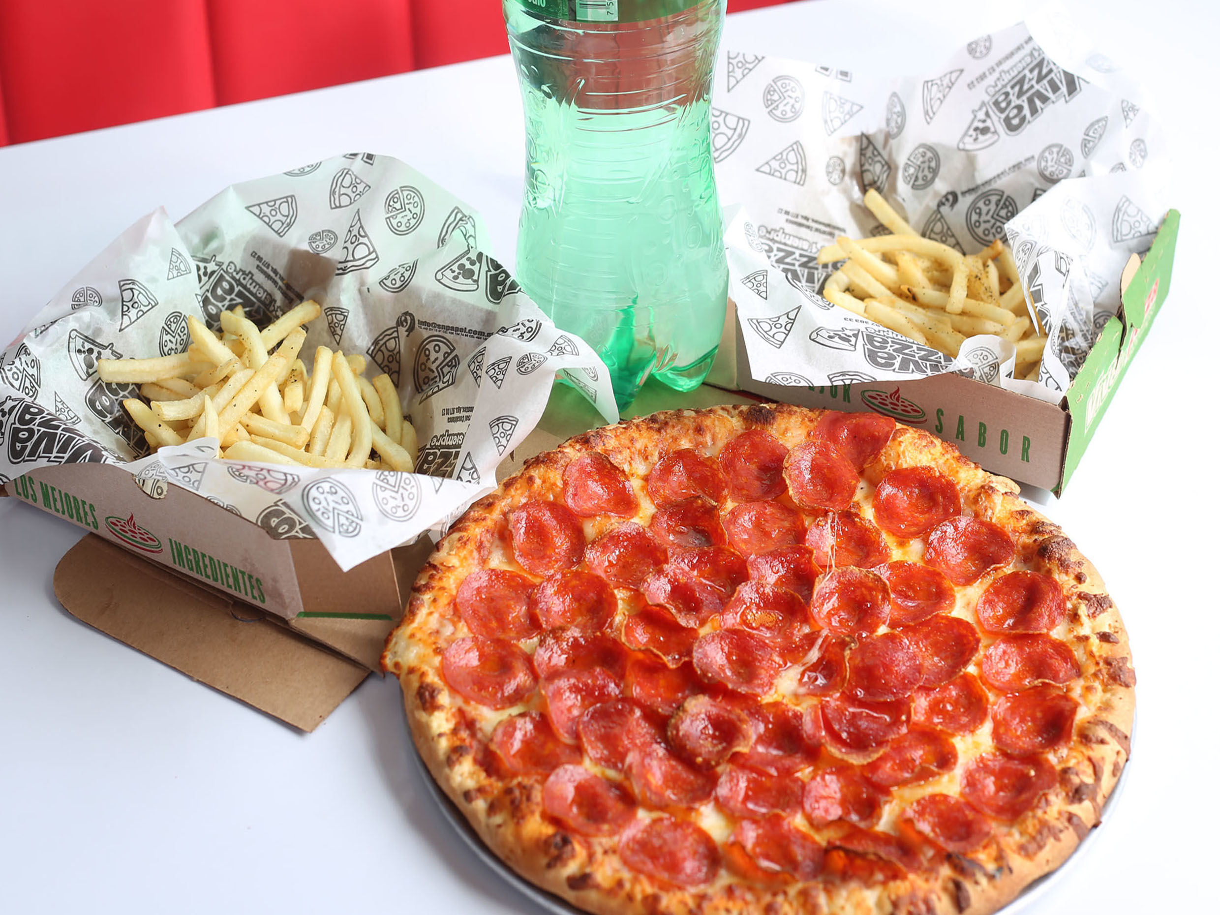 1 pizza grande, 2 ordenes de papas y un refresco familiar.
