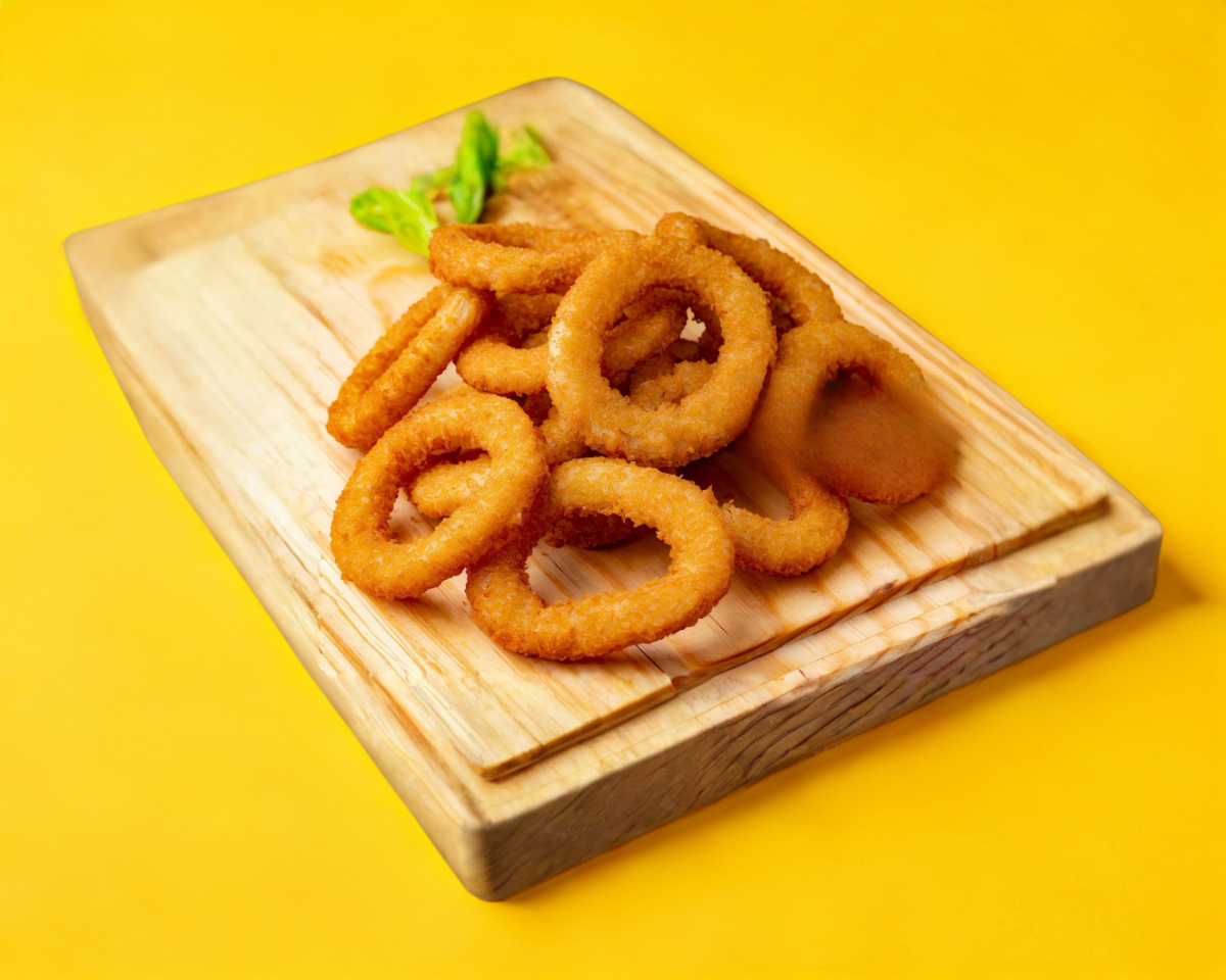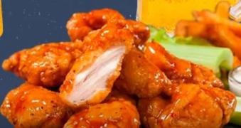4 alitas, 4 boneless, papas gajo y aros de cebolla