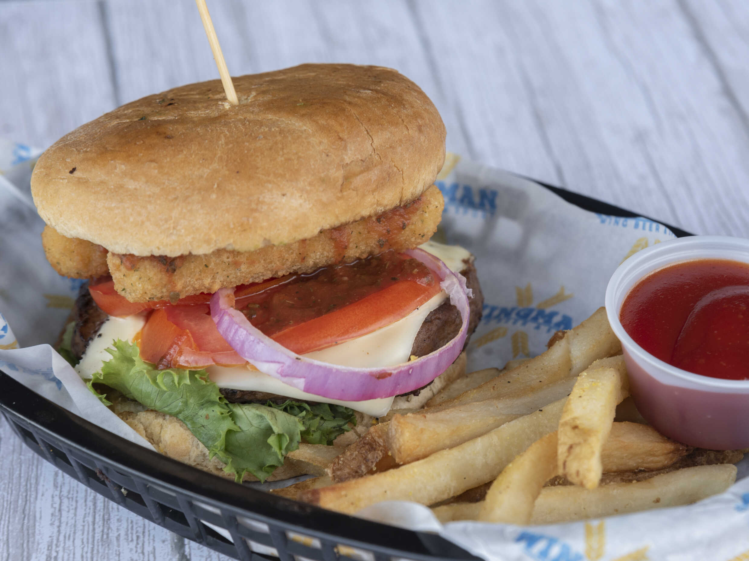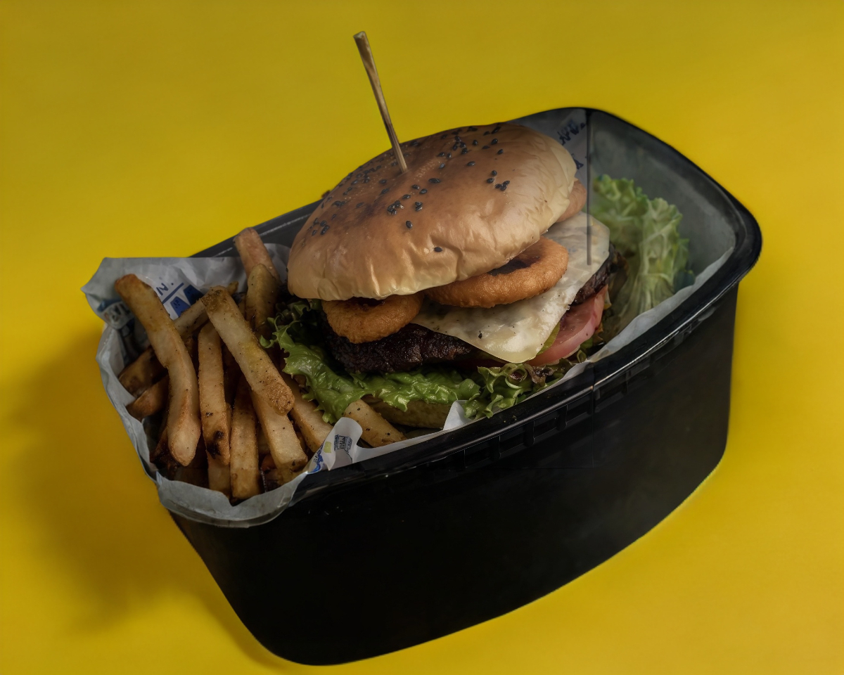 Inmensa en sabor, carne de res, queso, dedos de queso, salsa marinara, tomate lechuga, pepinillos y cebolla