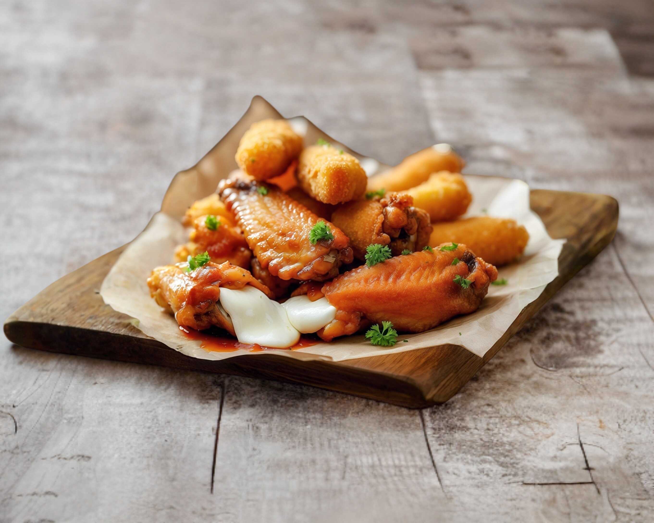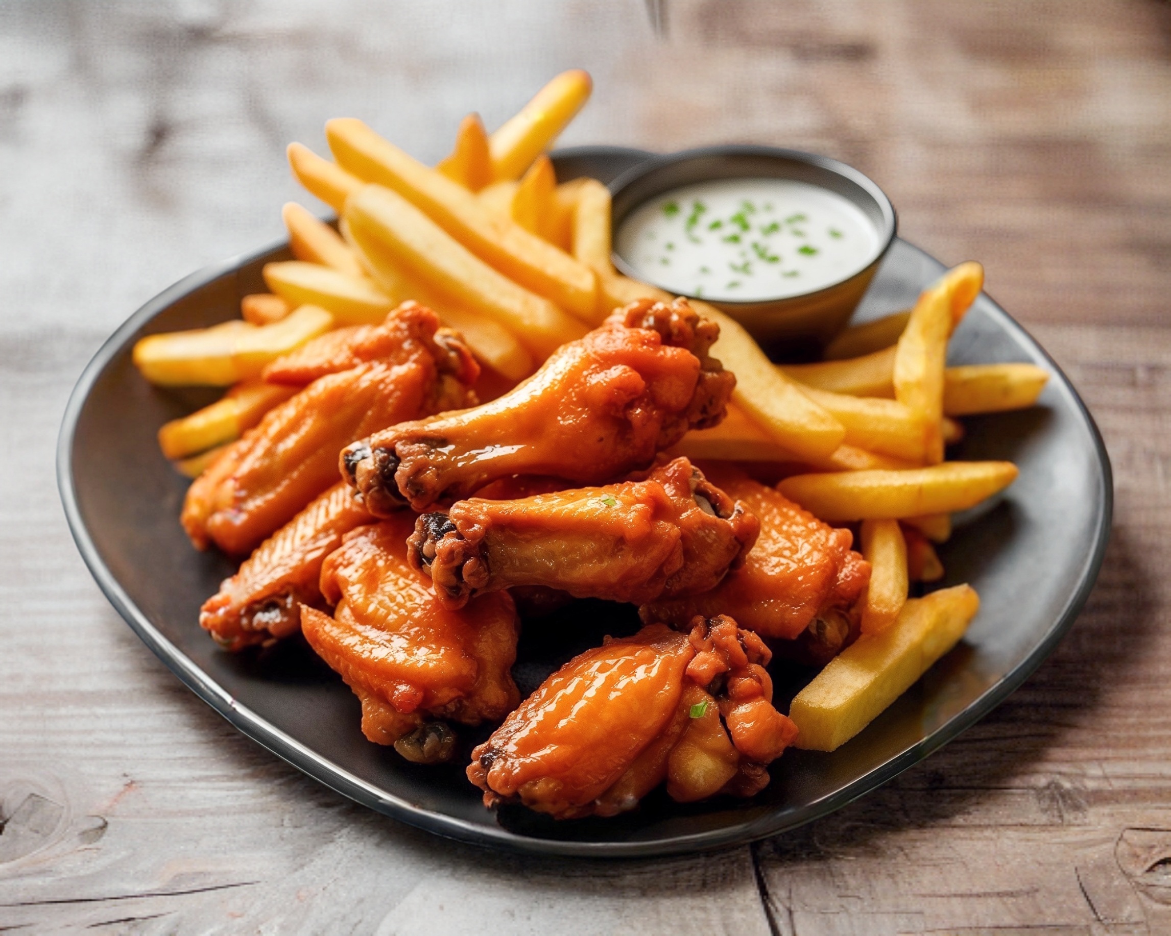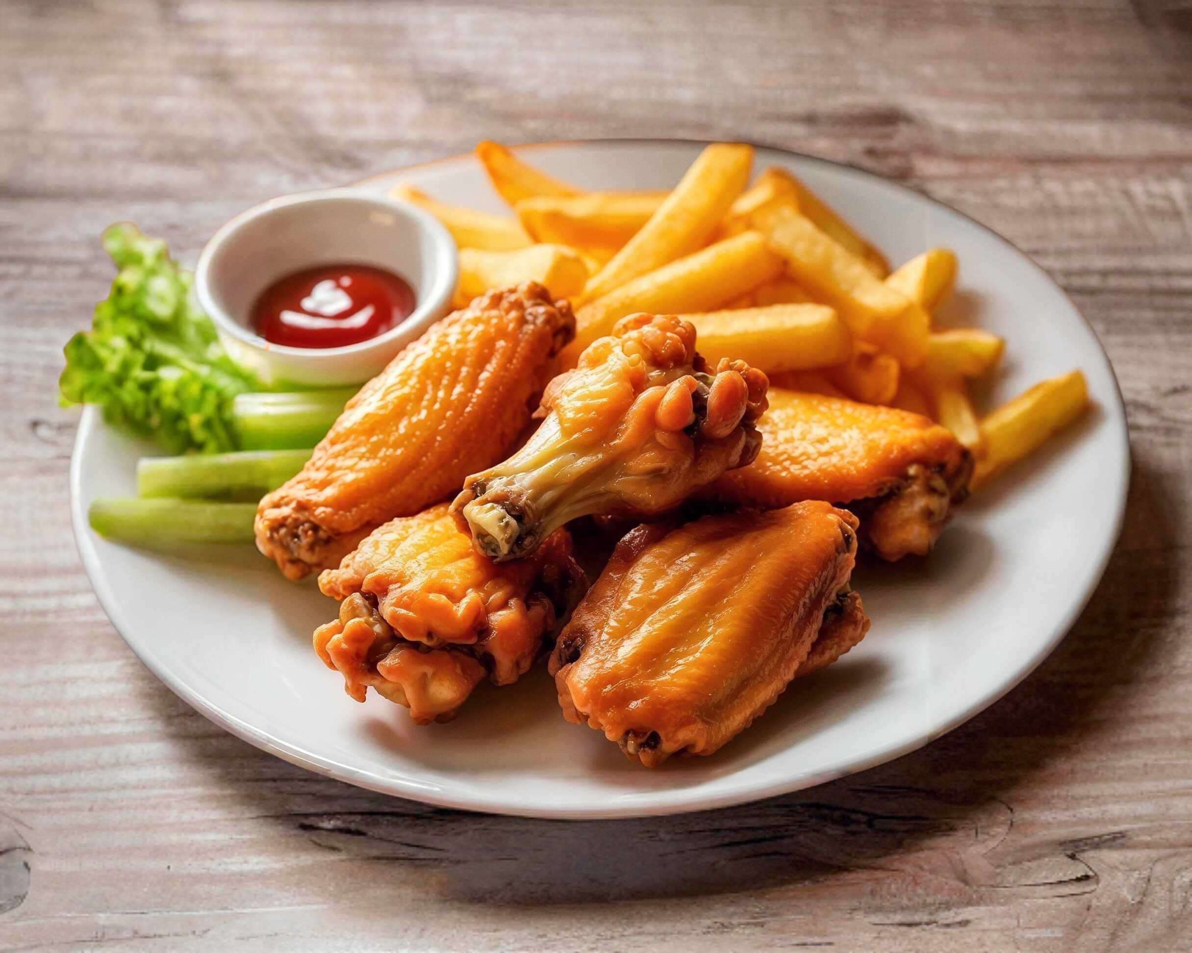 alitas de pollo, papas a la francesa y aderezos