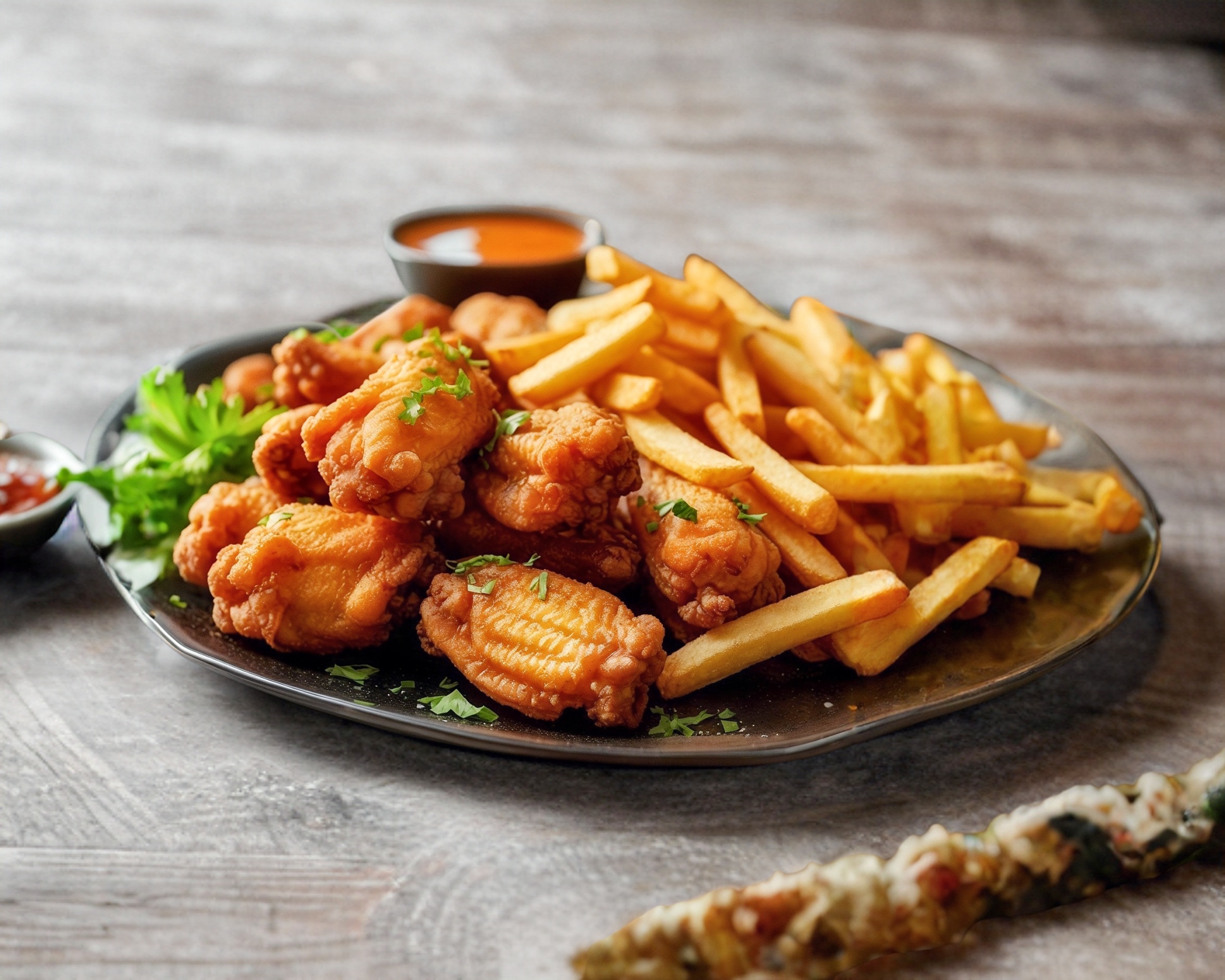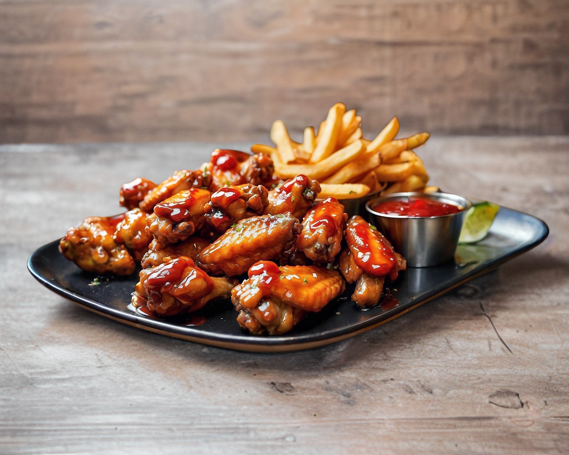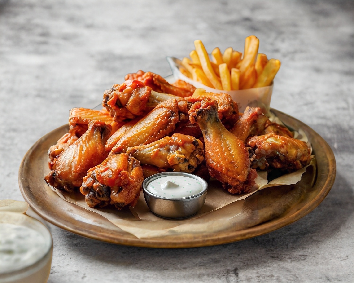 alitas de pollo, papas a la francesa y aderezos