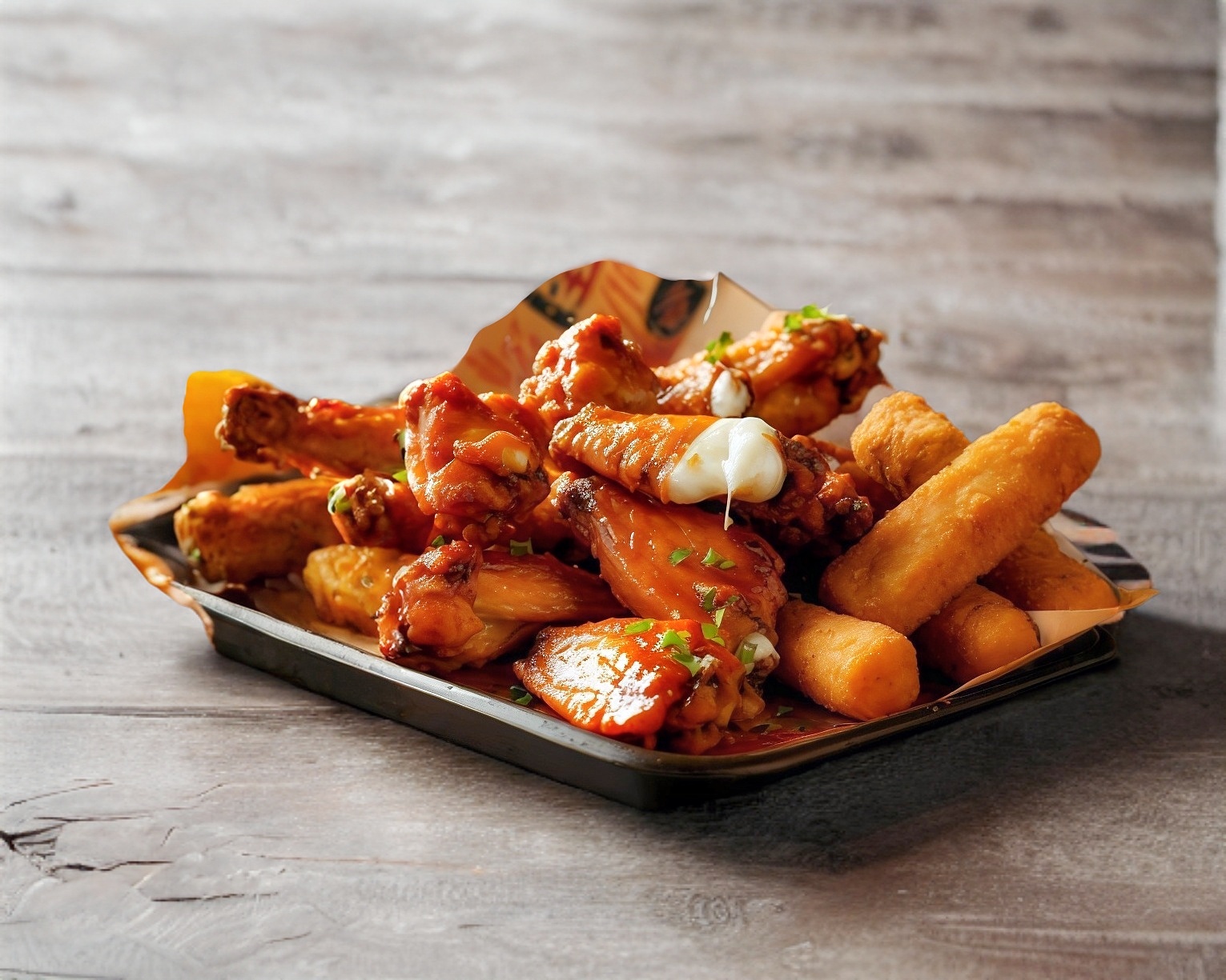 6 Dedos de Queso + Papas + Aderezos + 6 Alitas de Cualquier Sabor + Papas + Aderezos + 6 Boneless de Cualquier Sabor + Aderezos