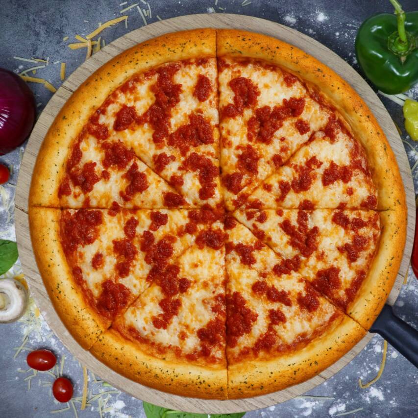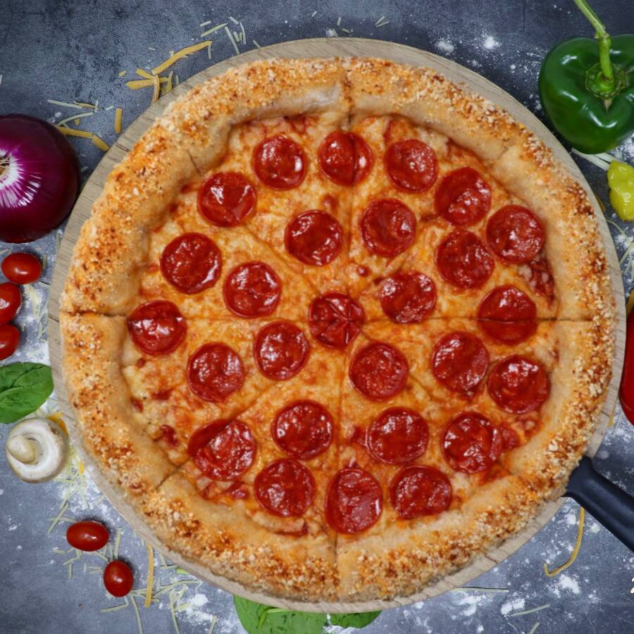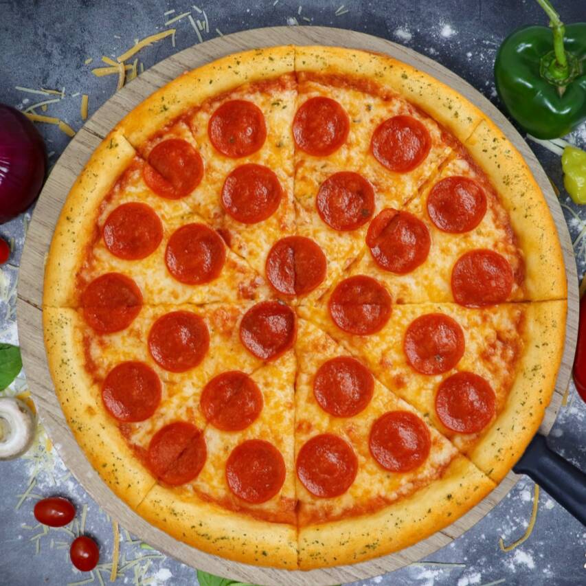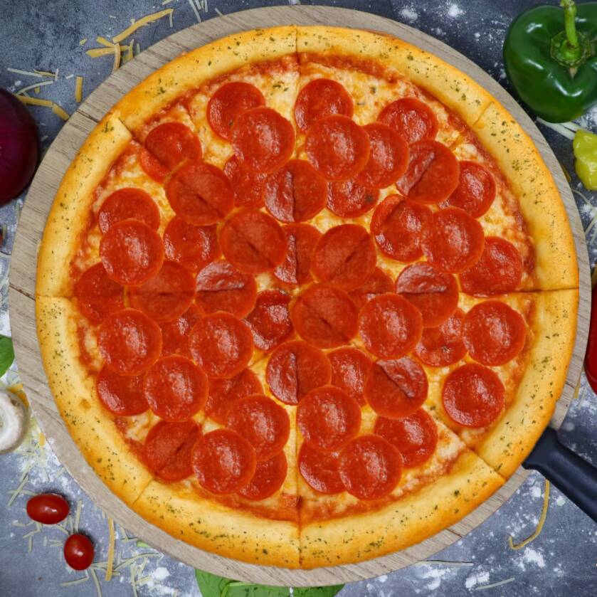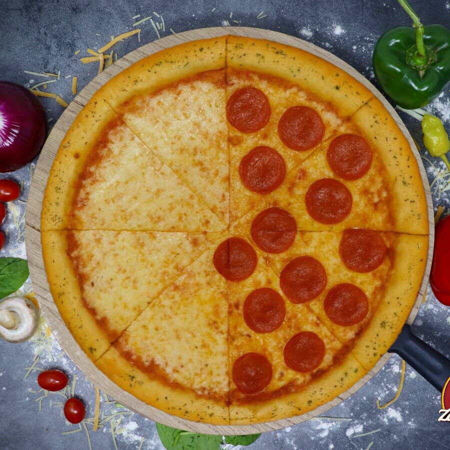 Pizza grande con salsa de tomate, queso mozzarella y mitad pepperoni.