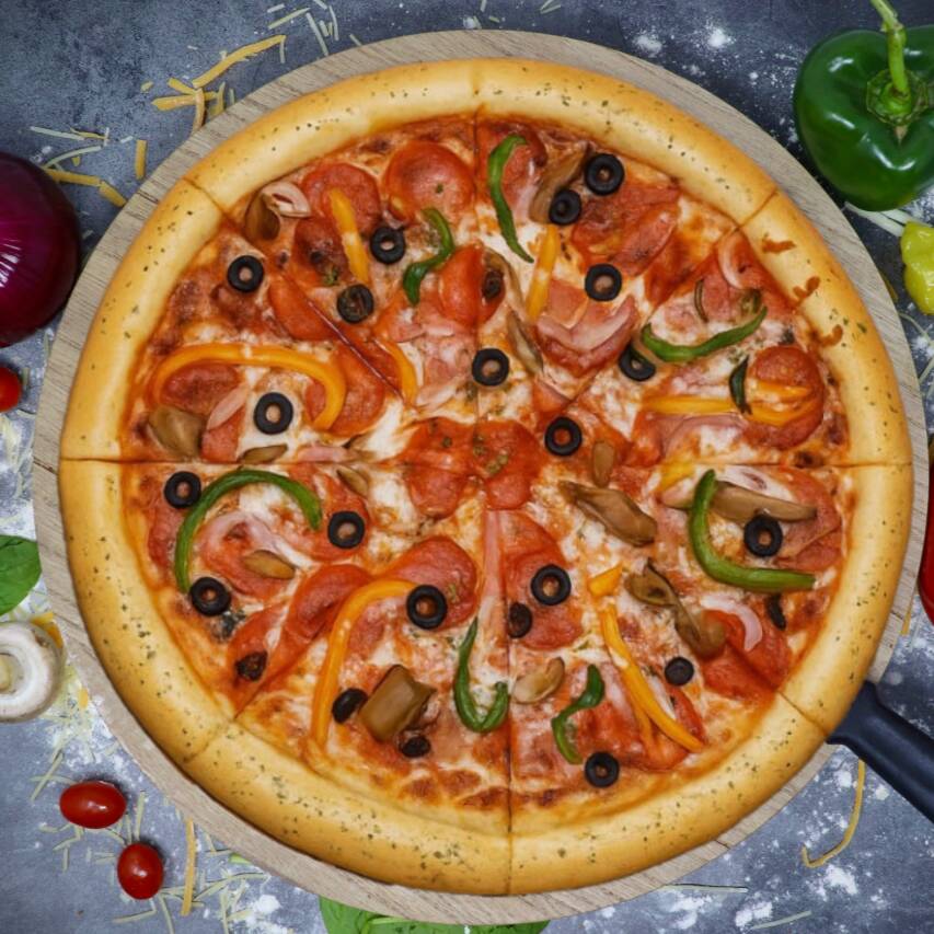 Pizza grande con queso fundido, trocitos de jamón, tocino suave, pimiento verde, pimiento rojo, cebolla morada, aceituna negra, pepperoni, carne de res y champiñoes.