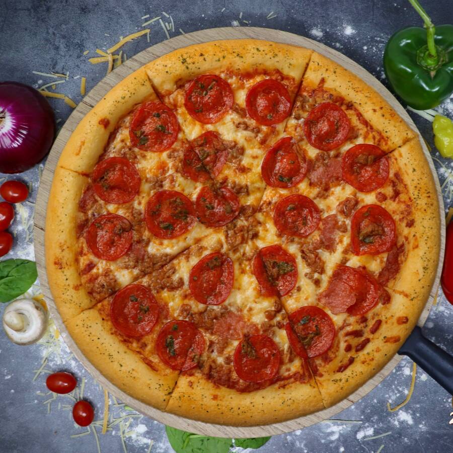 Pizza grande con queso fundido, trocitos de jamón, salchicha italiana, tocino suave, pepperoni y carne de res.