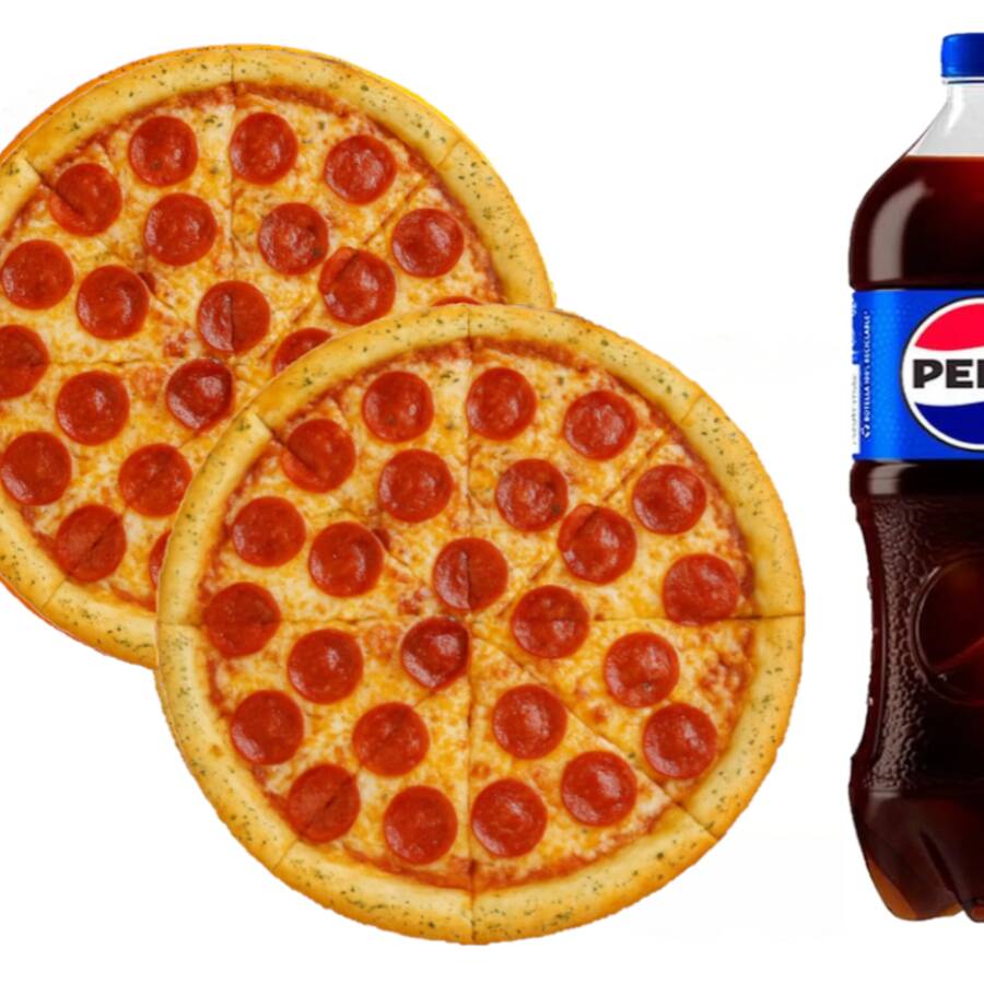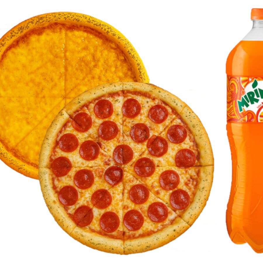1 pizza grande de pepperoni, 1 pizza de queso y una mirinda de 2lt.