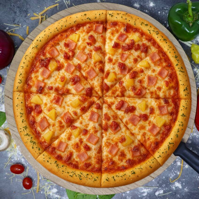 Pizza grande con queso fundido, trocitos de jamón, piña fresca y tocino suave.
