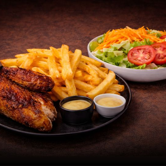 1 Pollo a la brasa, papas fritas, ensalada y cremas.