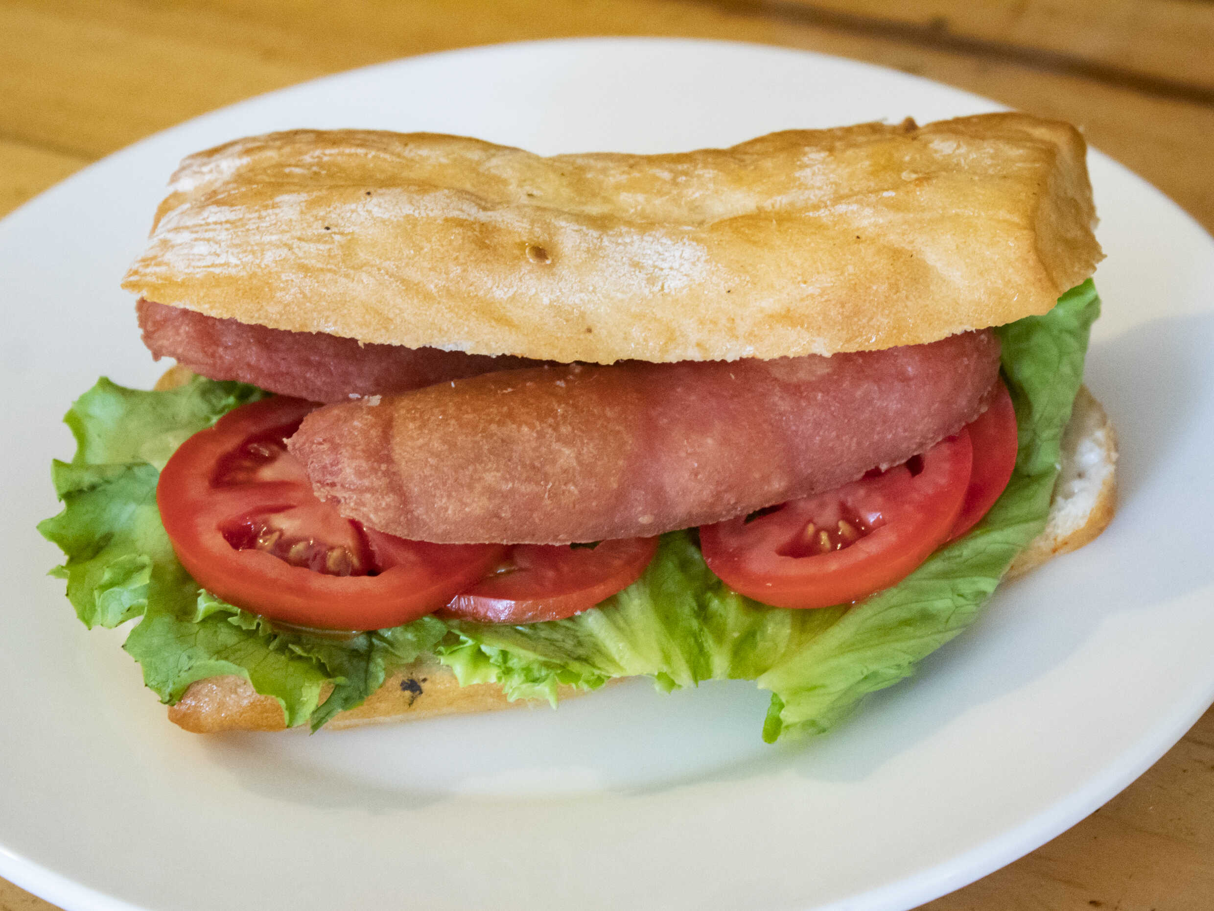 Láminas de durazno, pollo, jamón, lechuga y tomate en pan de molde blanco.