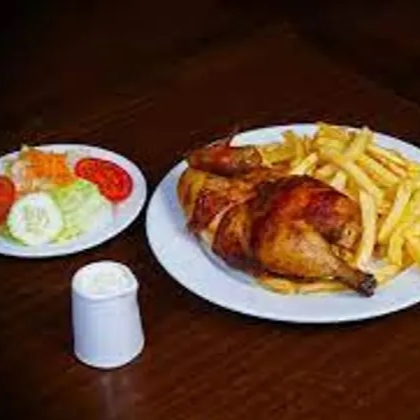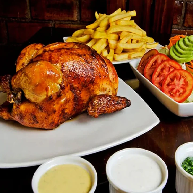 1/2 pollo a la brasa con ensalada, papas y cremas