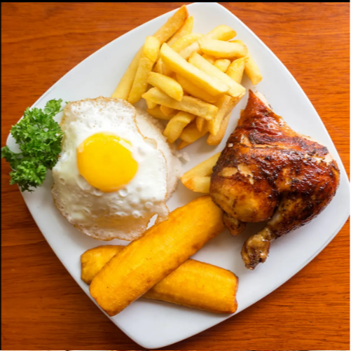 1/4 pollo a la brasa con arroz, papas, platanos y huevo frito