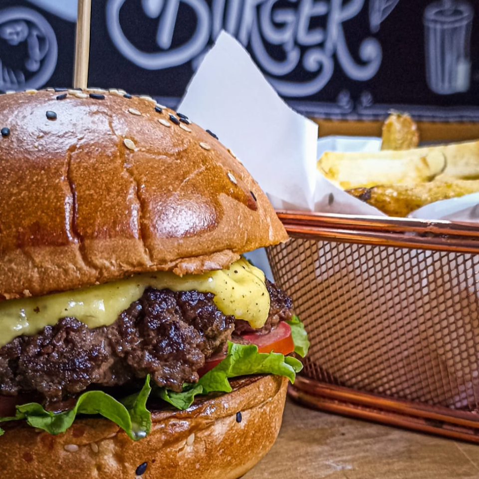 Hamburguesa de pura carne acompañada de vegetales frescos. Incluye una porción de papas fritas personales.