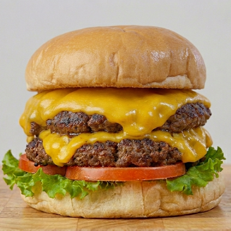 Doble porción de pura carne con doble queso cheddar y vegetales frescos. Incluye una porción de papas personales.