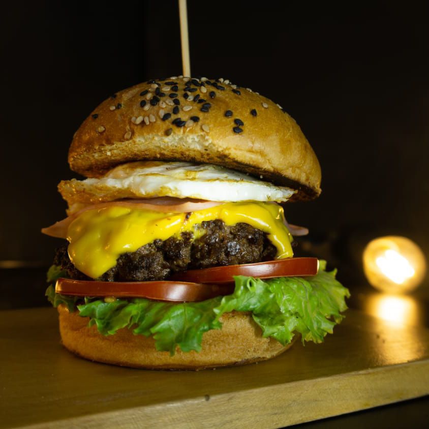 Hamburguesa de pura carne con queso cheddar, jamón, huevo frito y vegetales. Incluye una porción de papas personales.