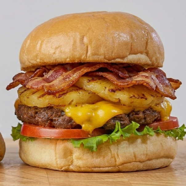 Hamburguesa de pura carne con queso cheddar, doble piña, tocino y vegetales. Incluye una porción de papas personales.