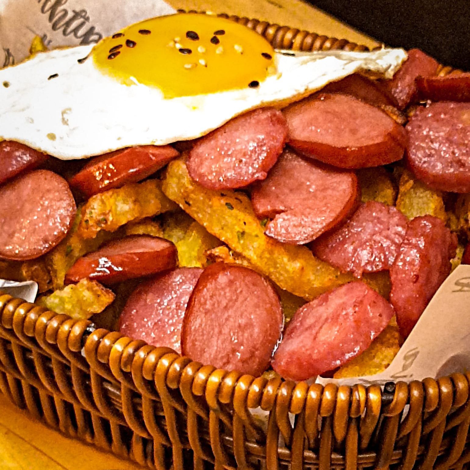 cortes de salchicha ahumada, chorizo finas hierbas, huevo frito y papas fritas