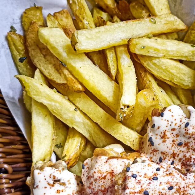 cortes de salchicha ahumada acompañado de papas fritas
