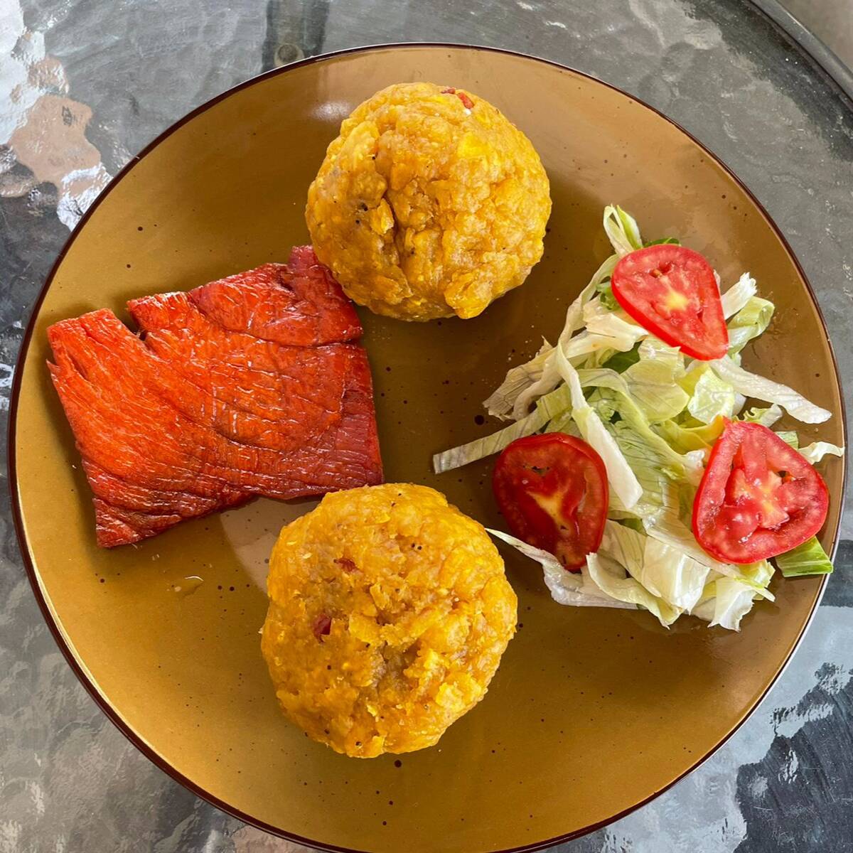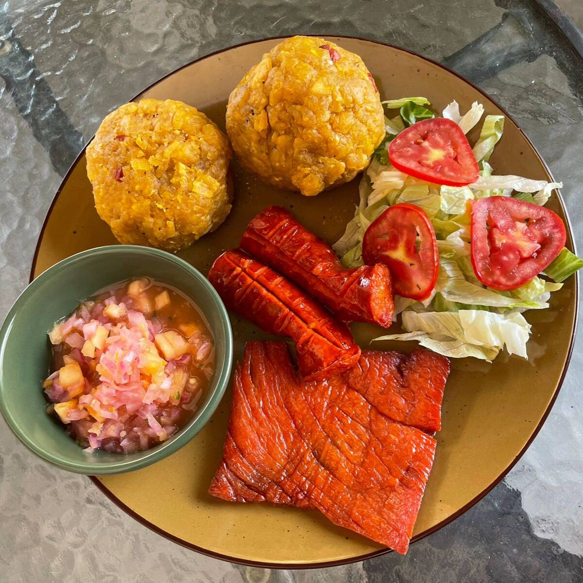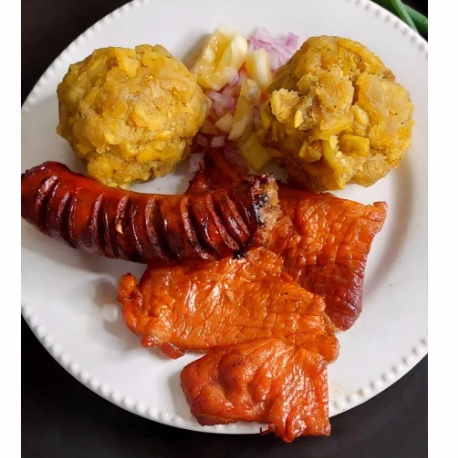 Bolas de tacacho con cecina, chorizo y ají de cocona, 2 piezas.