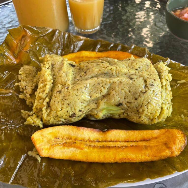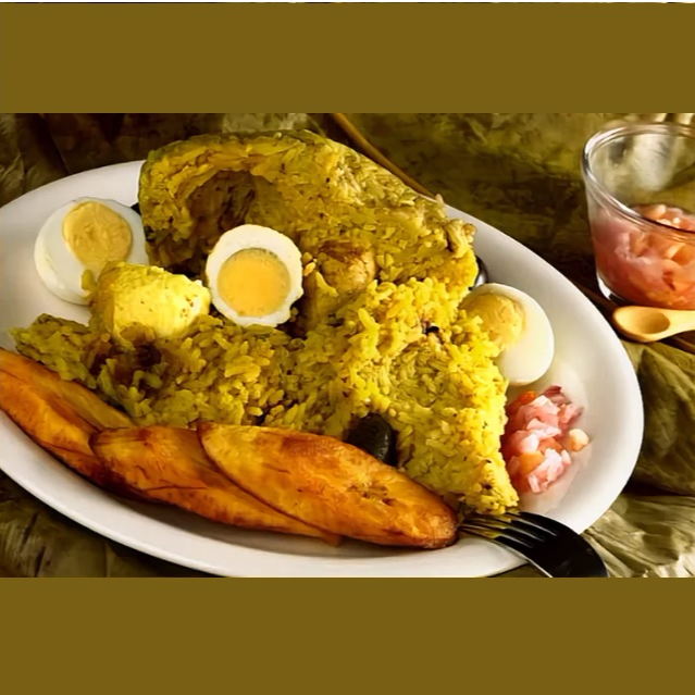 Juane de gallina, chaufa de cecina, porción de patacones, cecina, chorizo, plátano maduro frito y ají de cocona, para 3 personas.