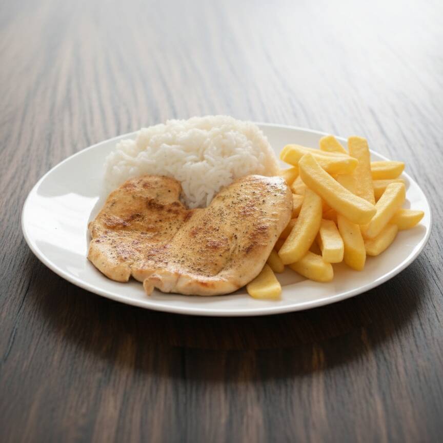 Disfruta nuestra pechuga de pollo a la plancha acompañado de papas fritas y arroz