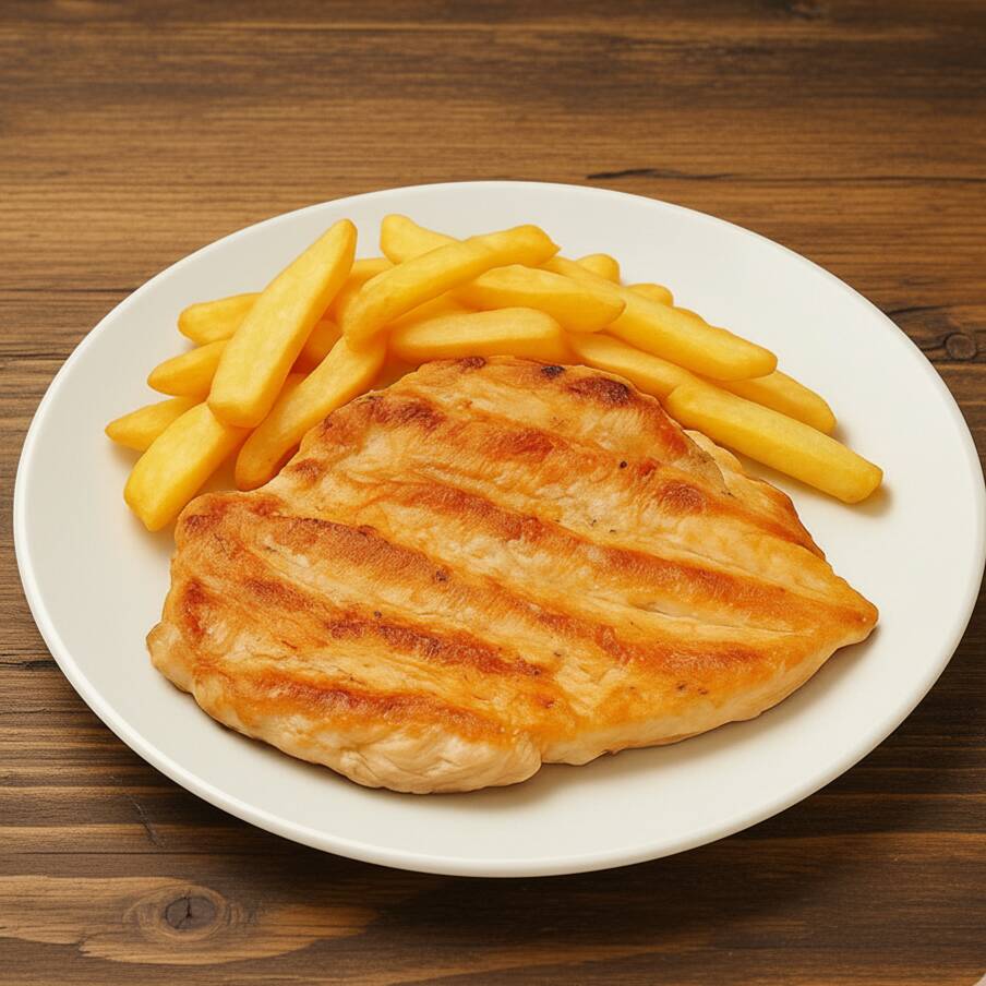 Disfruta nuestra pechuga a la parrilla acompañado de papas fritas.