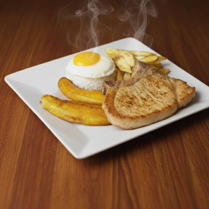 Disfruta nuestra chuleta acompañado de papas fritas, arroz ,huevo y plátano frito