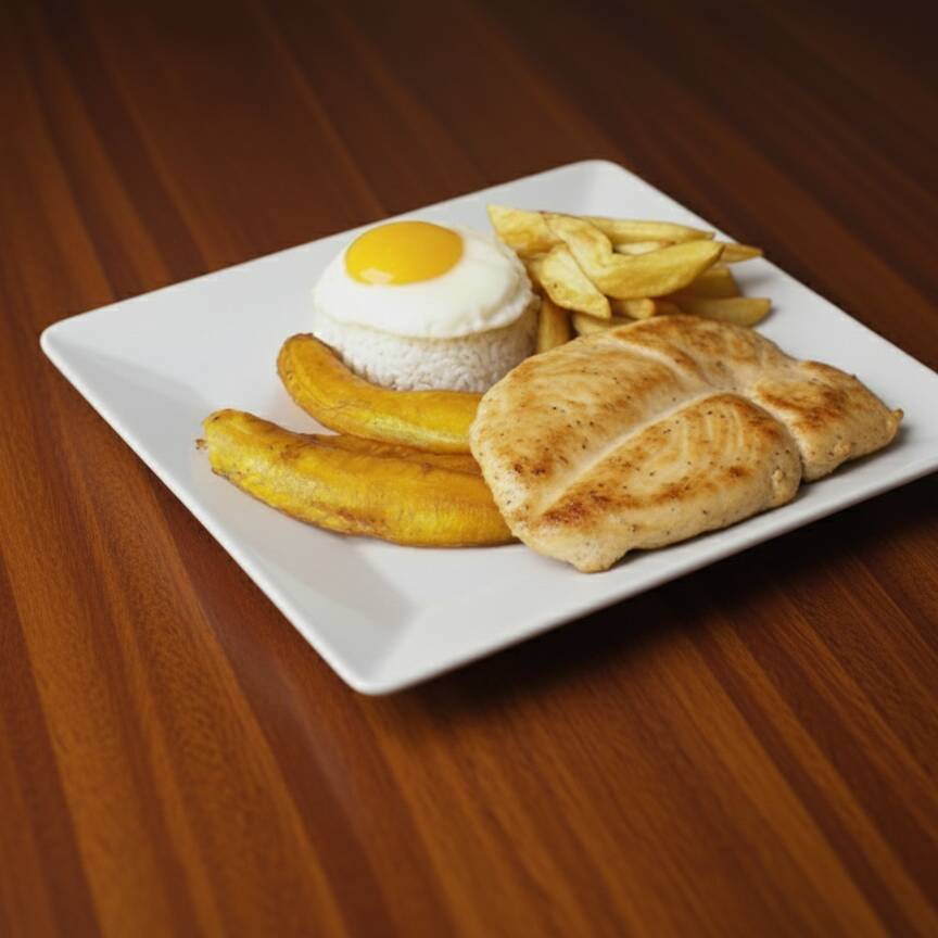 Disfruta nuestra pechuga acompañado de papas fritas, arroz, huevo y plátano frito