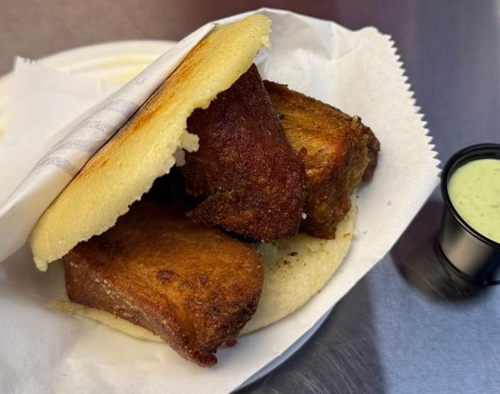 Arepa rellena con jugoso pollo desmechado, cocido a la perfección. ¡Un clásico que no falla!