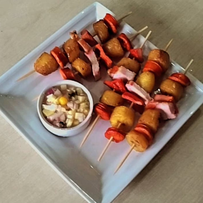 4 BROCHETAS MIXTOS, CECINA,CHORIZO, CHANCHO, MADURO FRITOS