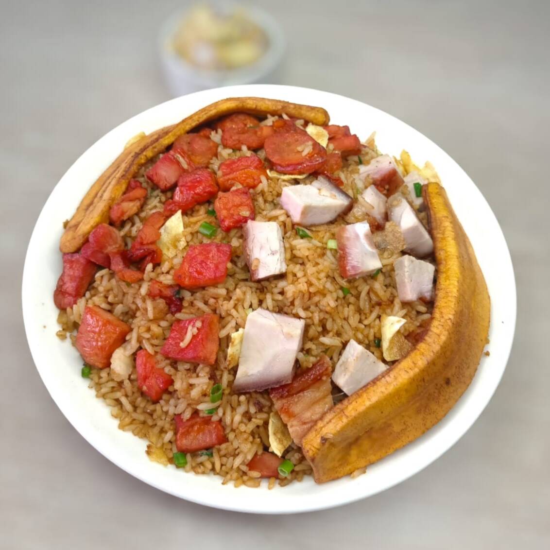 (La proteína va revuelta con el arroz )20g cecina amazónico en trozos, 20g chorizo amazónico en trozos, 30g chancho al cilindro en trozos, 350g arroz, 2 Rodajas de plátano maduro fritos, cebolla china, huevo, Ají de cocona, no lleva cubierto.)