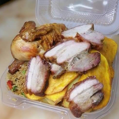 1/4 DE POLLO, 150G CHANCHO AL CILINDRO, ARROZ CHAUFA, PAPAS FRITAS, CAMOTE FRITOS, AJI DE COCONA, CREMAS.