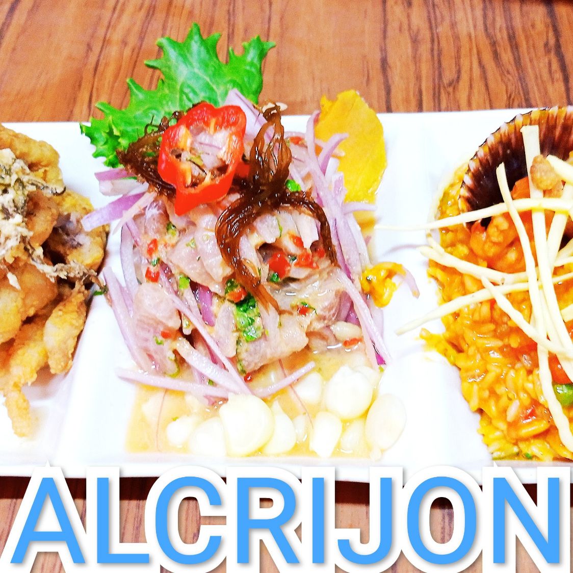 Ceviche, chicharrón y arroz con mariscos.