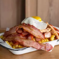 Papas fritas, salchicha en lonjas, filete de pechuga de pollo trozado, huevo frito y tocino.