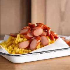 Papas fritas, salchicha en lonjas y salsas a elección.