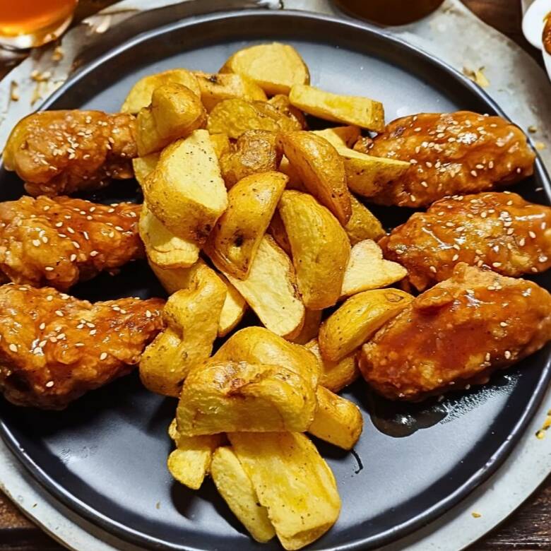 3und alitas bañsada en salsa bbq acompañadsa de chufa+cremas