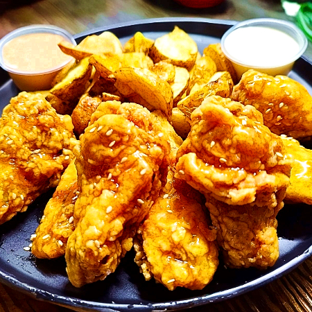 400 g Trozo de pollo crispy más papa nativas y cremas.