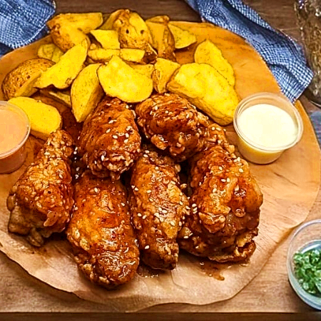 6pz alitas bañadas en salsa maracuya+papas nativas+cremas caseras