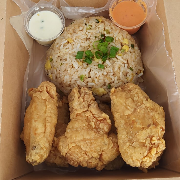 400 g Trozo de pollo crispy más chaufa y cremas.