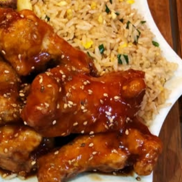 180 g Trozo de pollo crispy más chaufa y cremas.