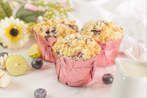 Nuestro muffin de arándanos y limón con textura suave mezcla perfecta entre el arándano y el limón, con yogurt y decorado con crumble.
