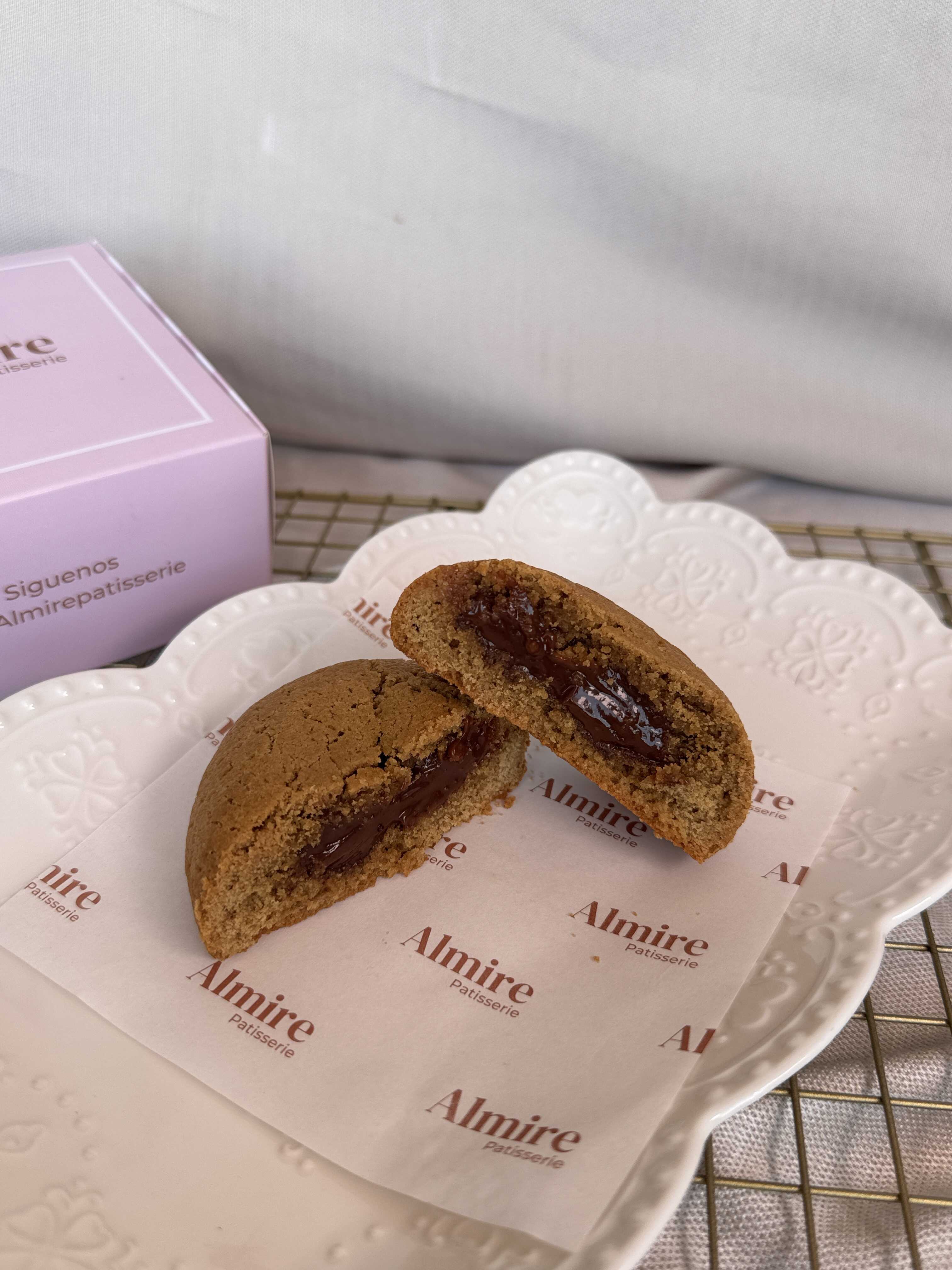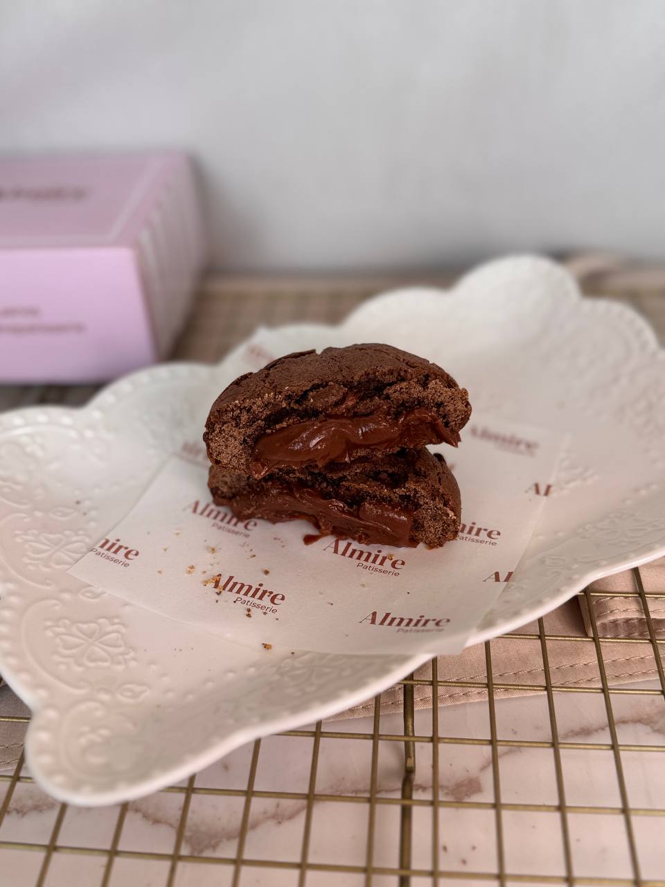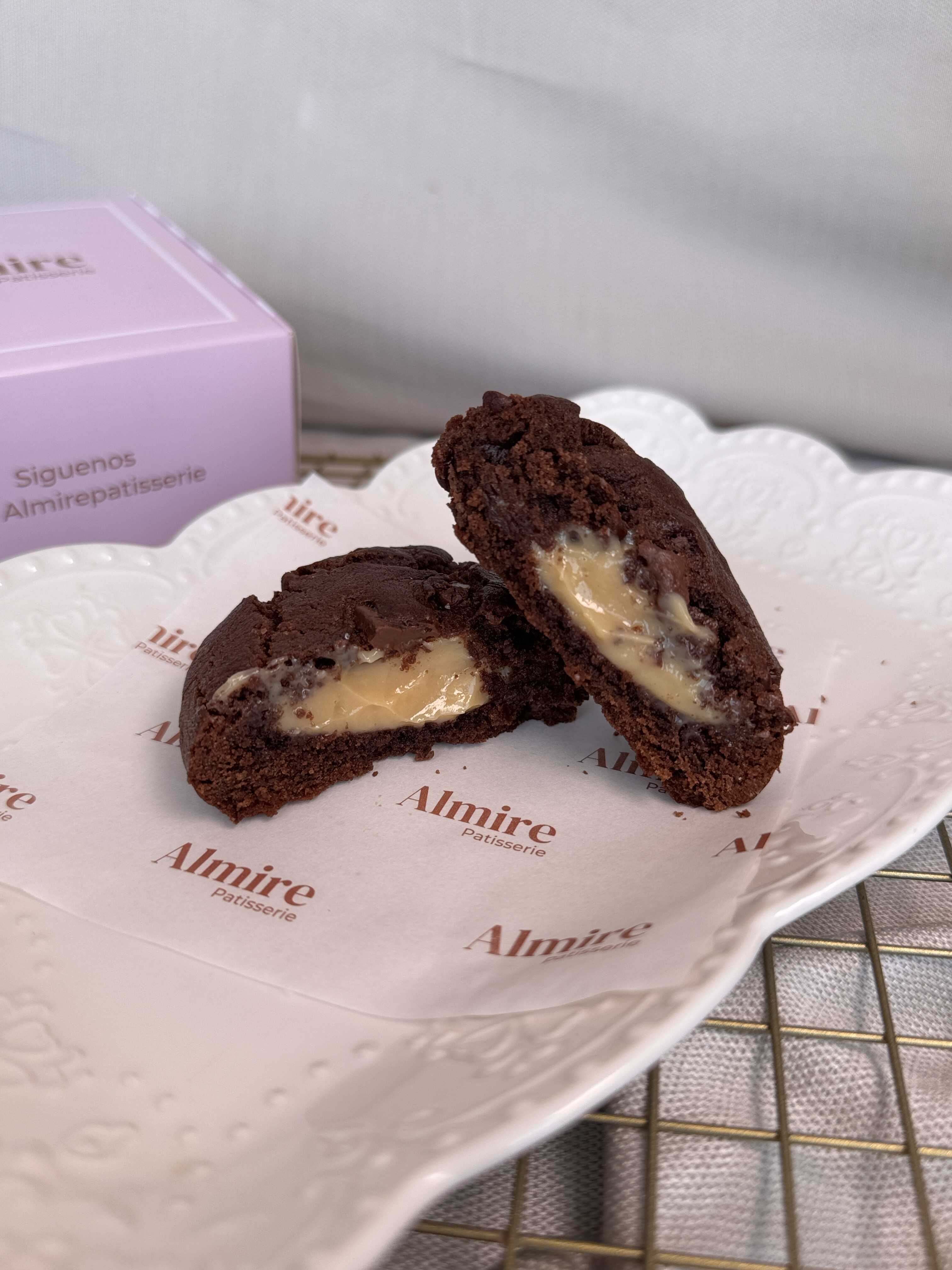 Galleta sabor a chocolate con chispas y trozos de chocolate relleno de fudge