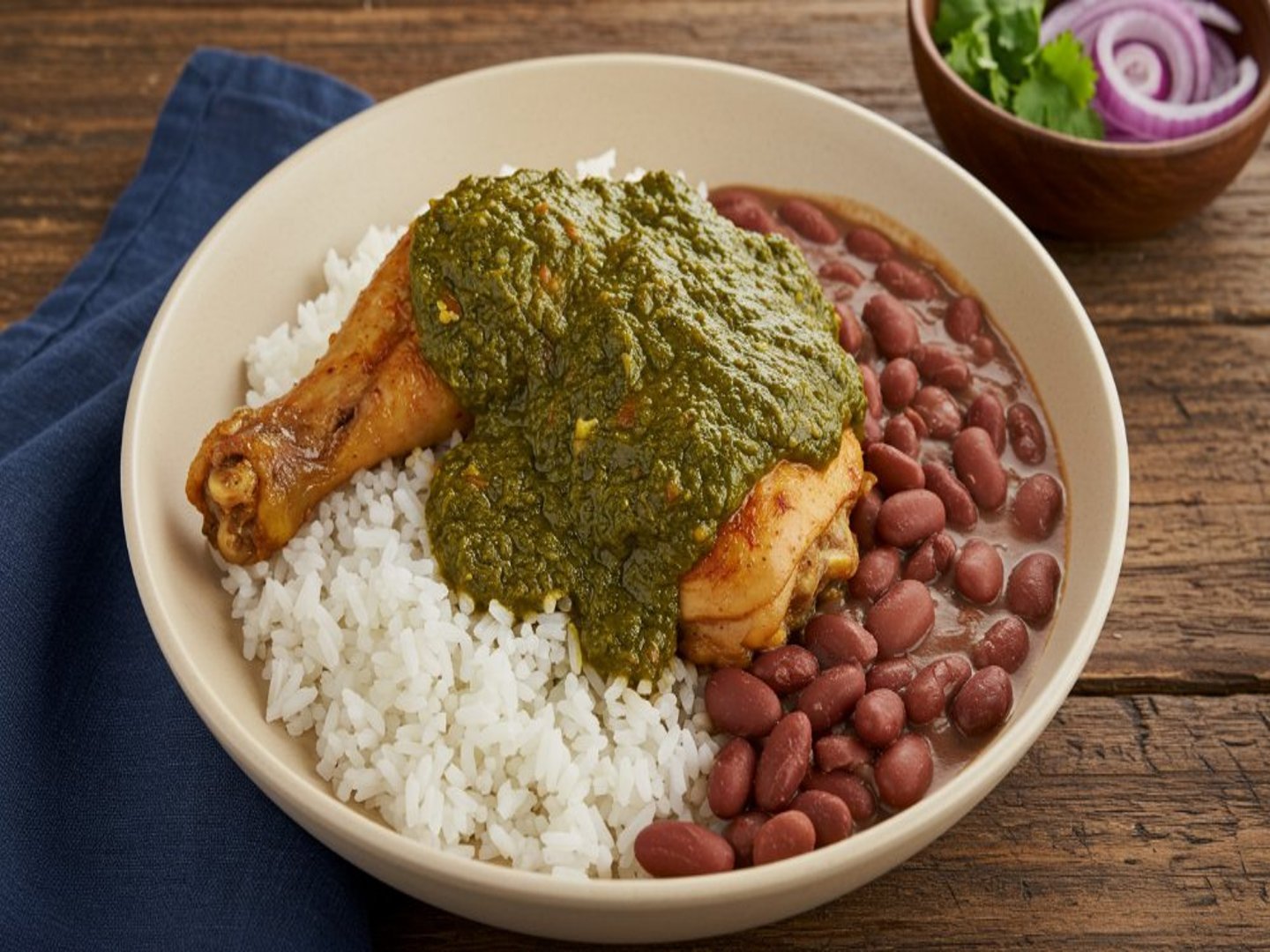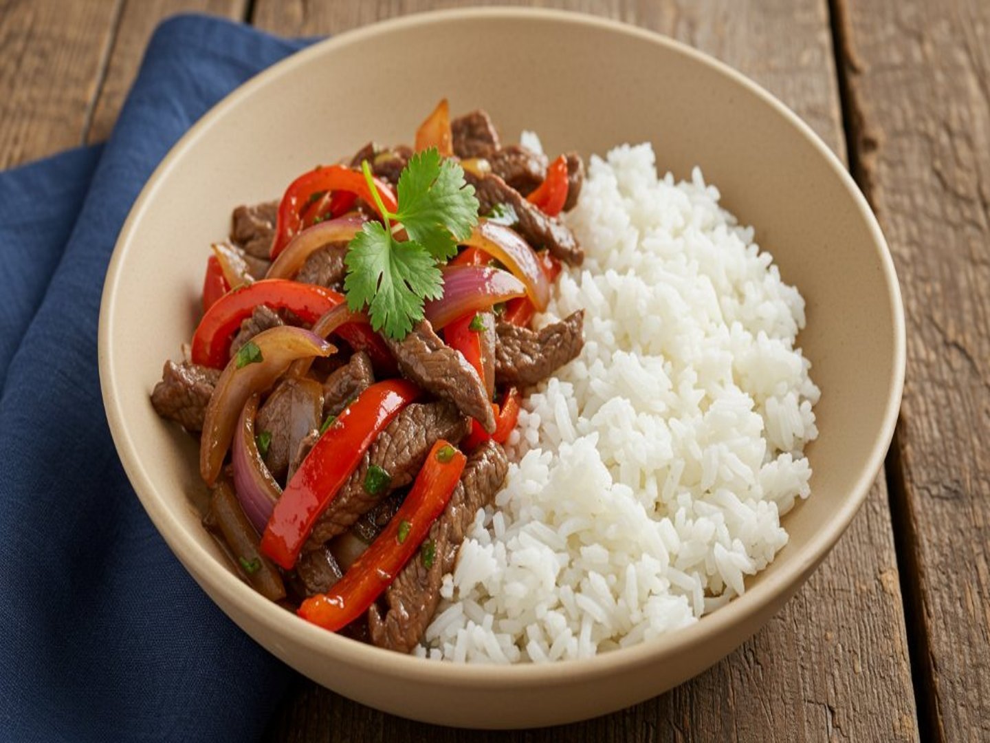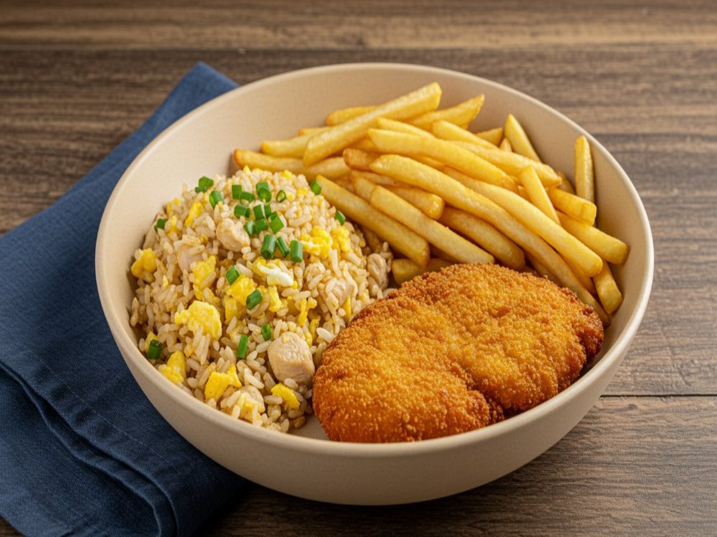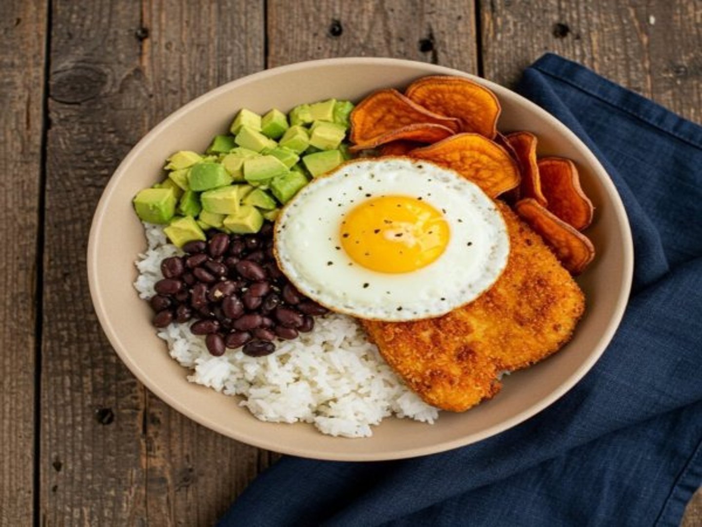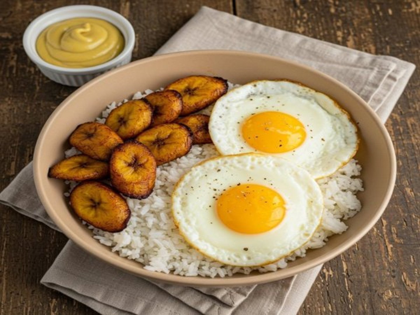 Elige el arroz de tu preferencia, dos huevos fritos y plátano bellaco. Recomendado con salsa de rocoto.
