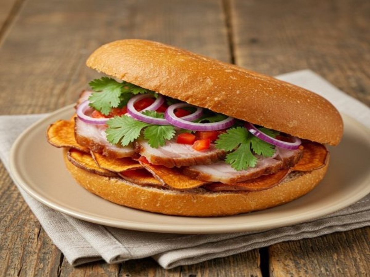 Tradicional Pan frances con chicharrón de cerdo, zarza criolla y chips de camote.