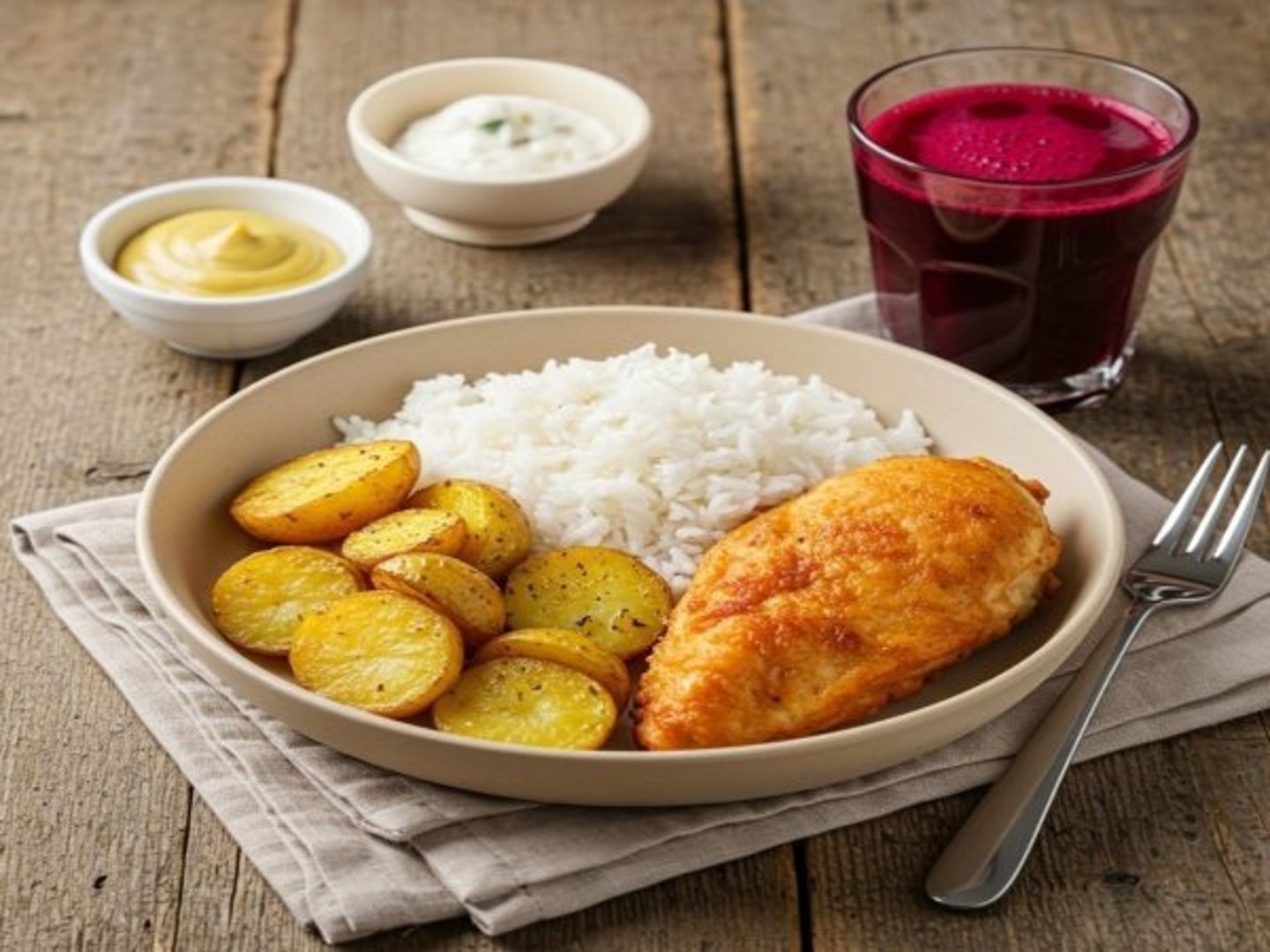 Milanesa de pollo apanada, papa y arroz a escoger. Recomendado con salsa y bebida a elección