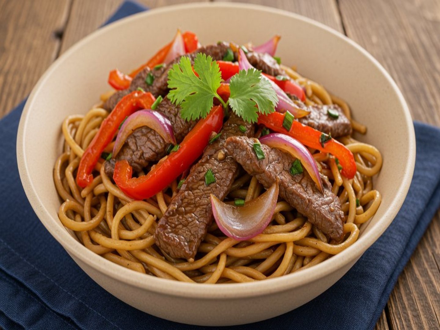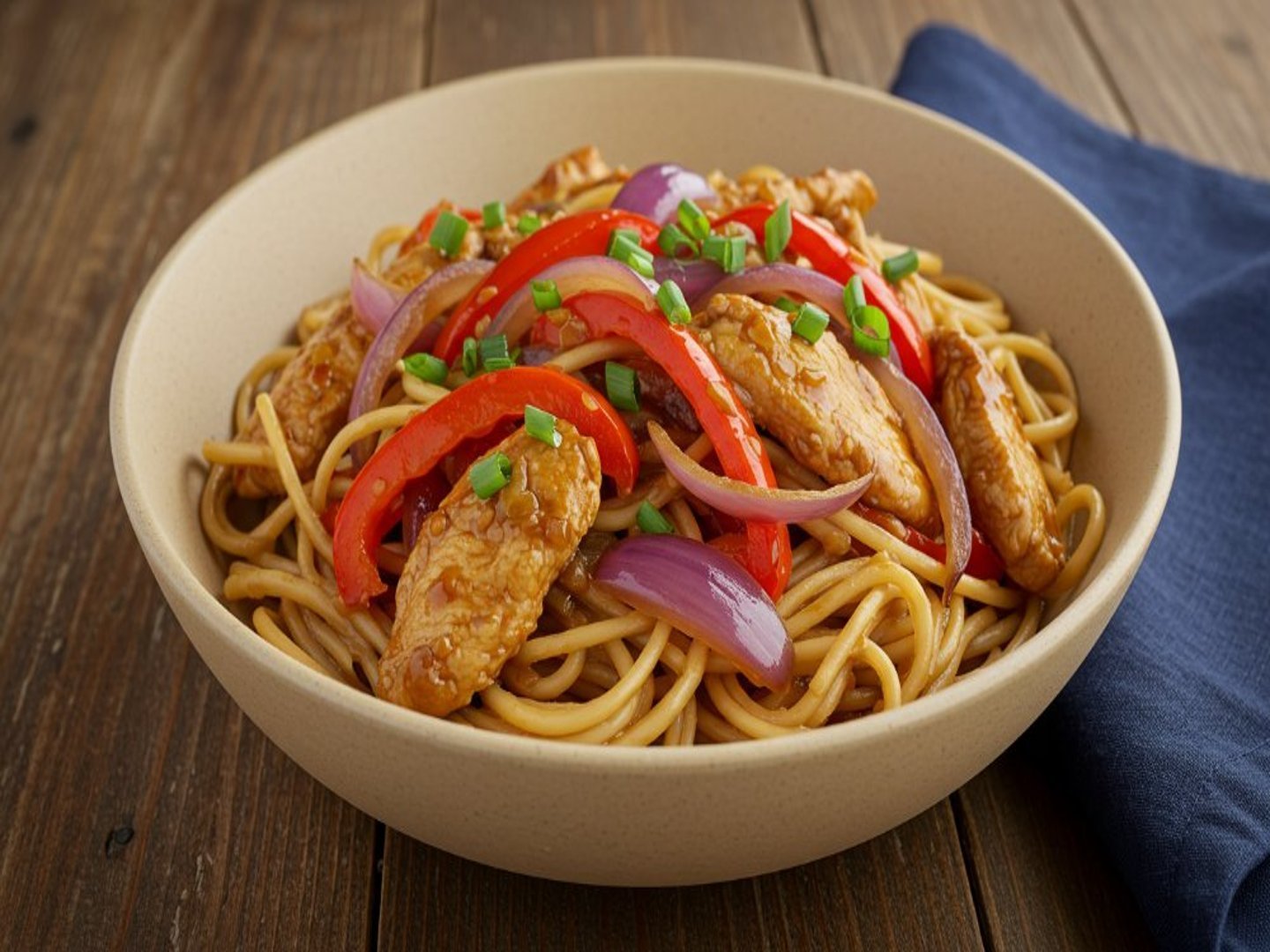 Mezcla de arroz chaufa y tallarín salteados con pollo.