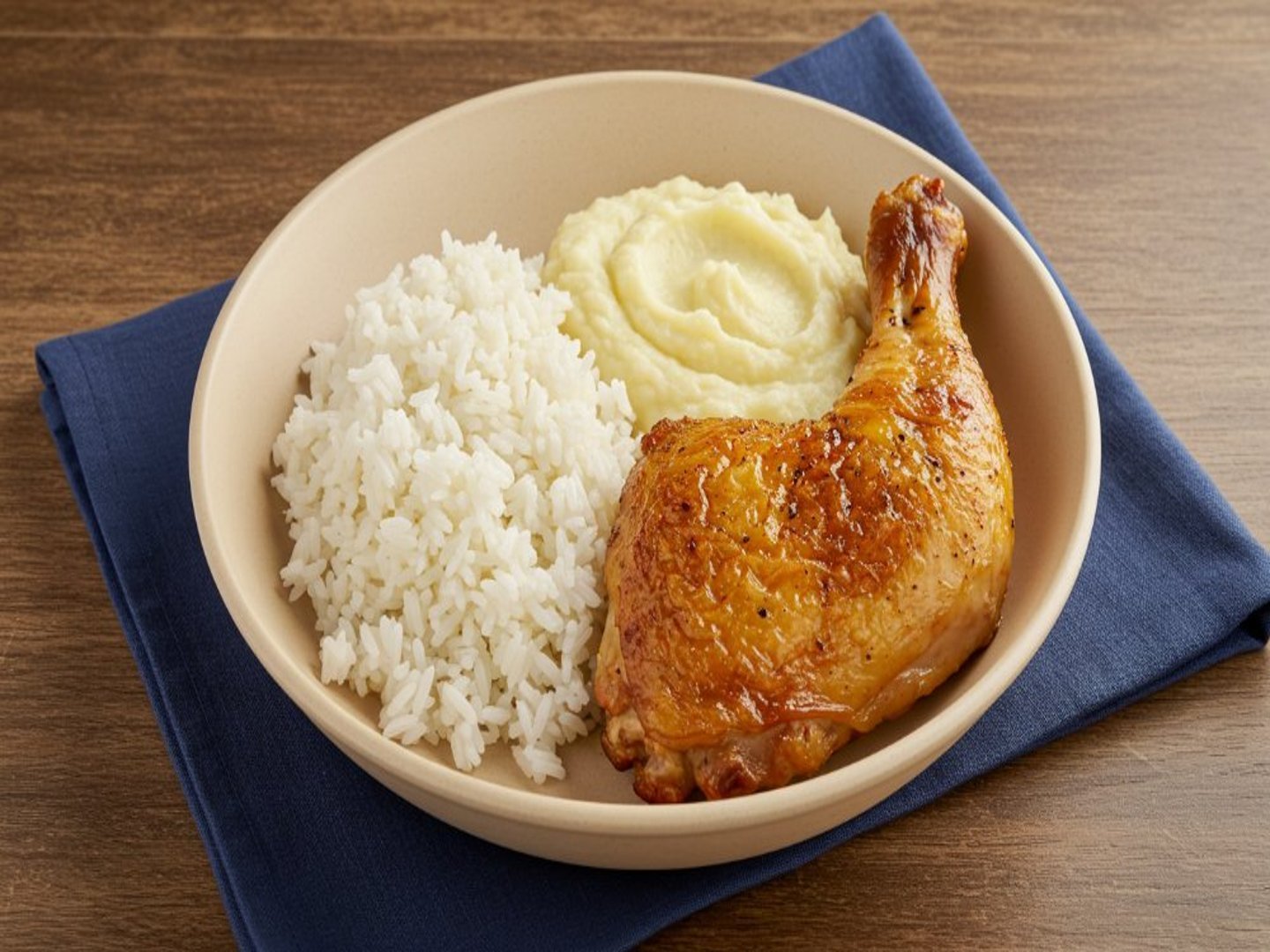 Pollo en salsa de champiñones, papa y arroz a escoger. Recomendado con salsa y bebida a elección.