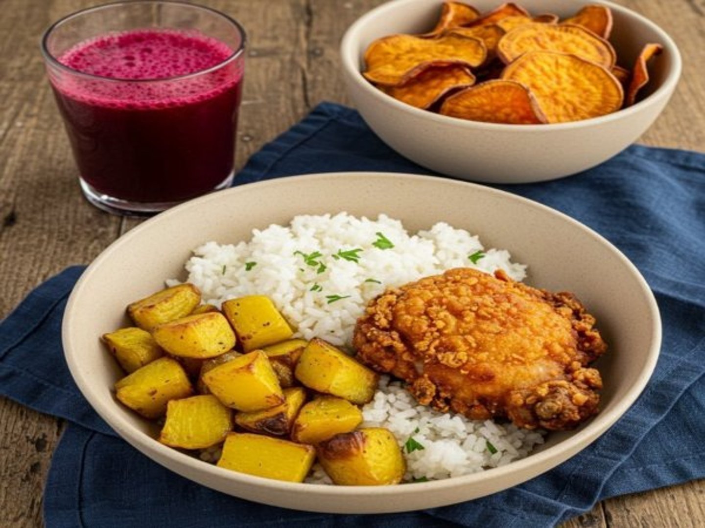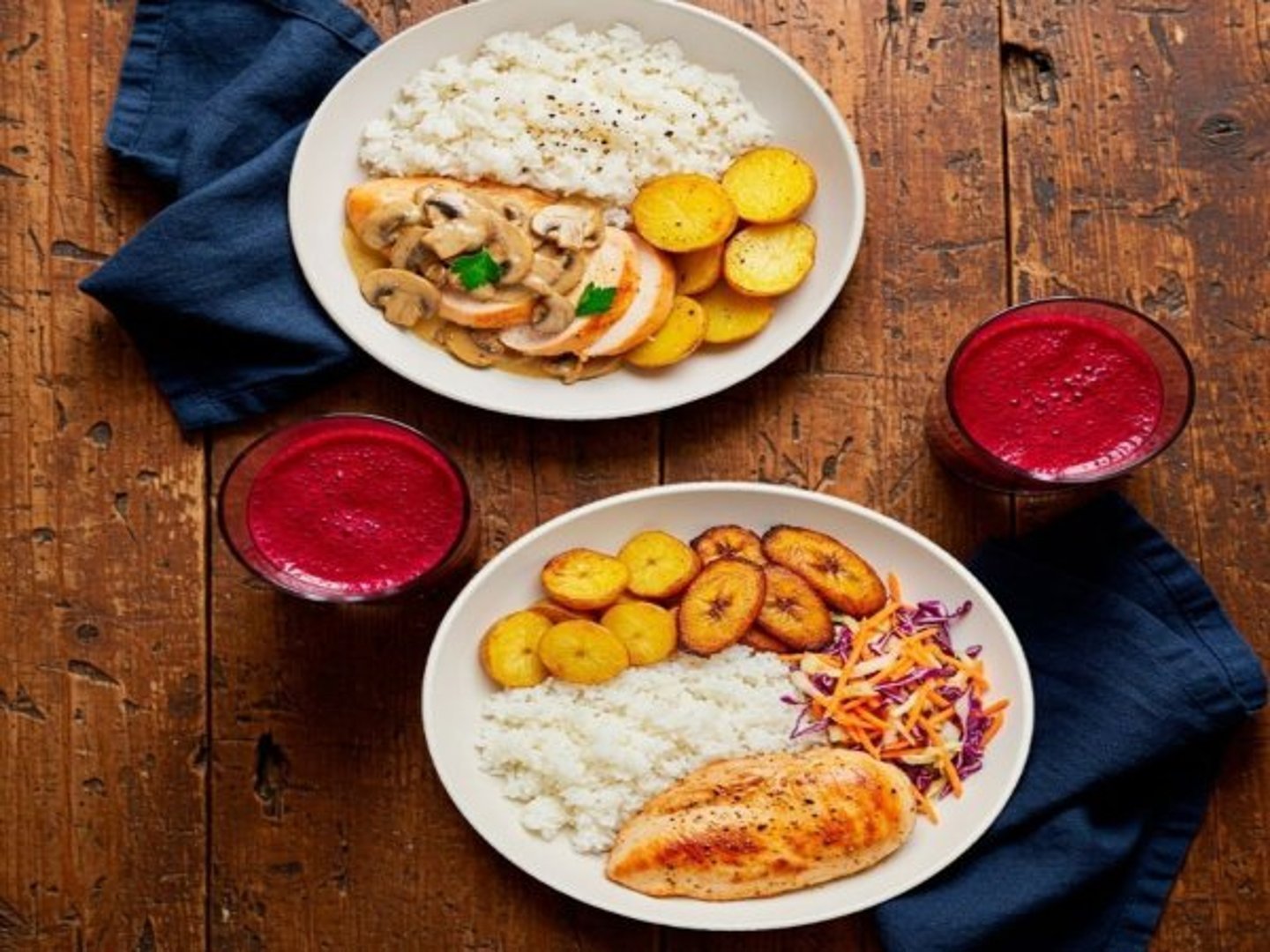 Bowl con Pollo parrillado, platano bellaco, ensalada de repollo y zanahoria, ketchup, papa y arroz a escoger.